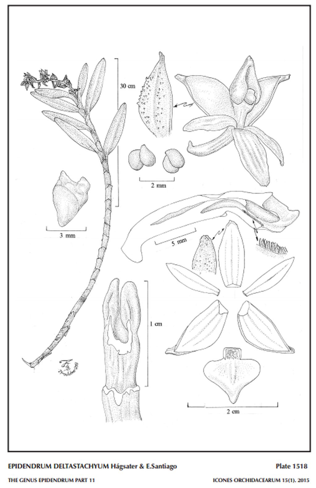 "Epidendrum deltastachyum belongs to the GROUP Macrostachyum SUBGROUP Macrostachyum, which is characterized by the monopodial plants with sub-apical branching, rugose leaf sheaths, large leaves generally spreading, racemose, erect inflorescence, and fleshy flowers generally green to black (ripe olive colored), as well as yellow to pink to purple, with an entire, conduplicate, generally ecallose and pubescent lip embracing the column, and the nectary pubescent to papillose in front of the stigmatic cavity and at least at the base of the lip. The species is recognized by the narrowly elliptic, obtuse leaves, sepals dorsally echinate, .6 to .68" [15 to 17 mm] long, petals oblong-elliptic, lip deltate, base truncate and the corners rounded, widely apiculate at the apex. Epidendrum dermatanthum has linear oblong to lanceolate, acute leaves, glabrous sepals, petals linear-lanceolate, and a cordiform lip with the base clearly cordate. Epidendrum palaciosii Hágsater & Dodson has longer inflorescences 3.6 to 8" [9 to 20 cm] long, cylindrical, with small floral bracts, .1 to .14" [2.5 to 4 mm] long, sepals dorsally muricate, .28 to .32" [7 to 8 mm] long, petals oblanceolate, apically rounded. Epidendrum rostrigerum Rchb.f. is vegetatively similar, but the sepals glabrous, .38 to .44" [9 to 11 mm] long, petals linear-oblong, falcate, lip lunate, nearly semi-orbicular, and the anther is prominently rostrate, surpassing the apex of the column." Hagsater etal 2015