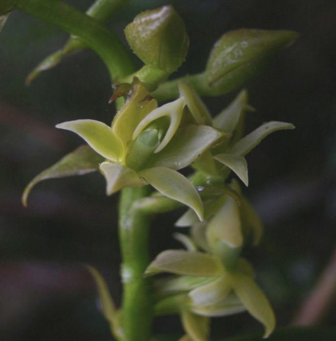 Found in Tungurahua province of Ecuador at elevations around 3000 to 3200 meters as a large sized, cold growing, monopodial epiphyte with branching in maturity, cane-like, terete, slightly arching stems enveloped basally by scarious sheaths and carrying numerous on the main stem, 6 to 8 persistent at the apex, articulate, alternate, partly spreading, narrowly elliptic, obtuse, margin entire, slightly revolute leaves that blooms in the winter on a terminal, slightly arching, occuring only once, peduncle .2" [5 mm] long, subterete, straight, rachis 4.6" [11.5 cm] long, terete, helicoid, 4.8" [12 cm] long overall, simultaneously 18 to 21 flowered inflorescence with prominent, somewhat longer than the ovary, gradually smaller above, triangular, acute, amplexicaul floral bracts and carrying non-resupinate, fleshy, green tinged with brown, turning orange brown with age flowers with the base of the lip and column green.