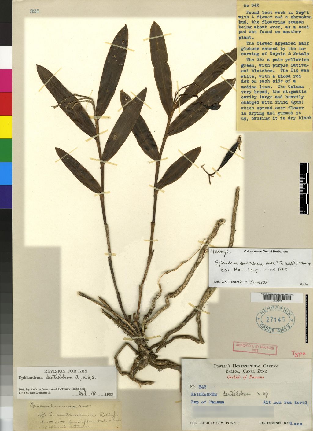 References W3 Tropicos, Kew Monocot list , IPNI ; The Genus Epidendrum Ames 1936; The Orchids of Panama L.O. Williams & P Allen 1946; Ceiba Vol 5 No 1 L O Williams 1956; Icones Orchidacearum Brasilenses Vol I Plate 078 Castro & Campacci 2000 drawing fide; Orquideas de la Serrania del Baudo Misas Urreta 2005 drawing/ photo fide; Icones Orchidacearum Vol 11 Plate 1117 Hagsater & Sanchez 2008 drawing fide; Orchids of French Guiana Szlachetko, Veyret, etal 2012; Orquideas, Tesoro de Colombia Vol 2 Ortiz & Uribe 2017 Drawing/Photo fide;