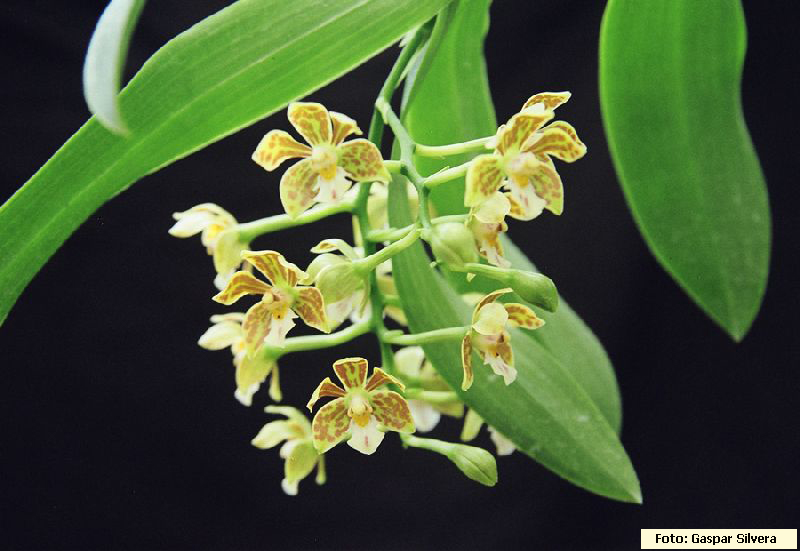 "Epidendrum dentilobum belongs to the GROUP Coronatum SUBGROUP Coronatum characterized by the relatively large plants with stems carrying many leaves and blooming on an apical, racemose inflorescence without spathaceous bracts and large waxy flowers with a 3 lobed lip that is basally bicallose. The species is recognized by the caespitose habit, with several fleshy leaves along the apical half of the thick stem, the racemose to paniculate, apical, few-flowered inflorescence, the flowers greenish-yellow with reddish brown spots, with the lip only partly united to the short, conical column and forming a wide cavity, the lip 3-lobed, with the lateral lobes small and triangular, and the midlobe semicircular, flabellate, and the base of the lip with two short calli and a horn-shaped, short keel in the middle, similar to the calli. We cannot place the species very close to any other. The plant habit is superficially similar to Epidendrum coronatum Ruiz & Pavón, but that species has larger, more numerous, ivory-white flowers with the lateral lobes of the lip dolabriforrn and much larger than the midlobe. The flowers are somewhat reminiscent of Prosthechea vespa (Vell.) W.E. Higgins, due to the brightly spotted sepals and petals, and the fleshy, toothed clinandrium-hood, though that species has long thin pseudobulbs with apical leaves, and an erect, simple inflorescence with non-resupinate flowers." Hagsater etal 2008