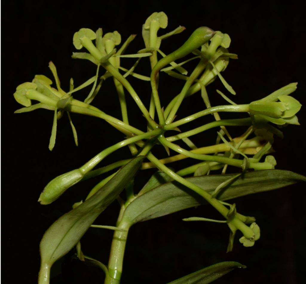 Found in Peru in the central wet forests in the municipality of Oxapampa, at elevations of 2100 to 2471 meters altitude on roadside banks with other orchids and in low montane forest and meadows with Xyris sp., Eriocaulaceae and Trichomanes lucens Sw. as a giant sized, cold growing terrestrial with cane-like, branching sub-apically, terete, erect, straight; the primary stem 68" x .24 to .48" [170 x 0.6 to 1.2 cm], branches 8 to 16" x .12 to .4" [20 to 40 x 0.3 to 1.0 cm], base covered by tubular, non-foliar sheaths and carrying numerous and larger on the primary stem, 8 to 10 on the branches, distributed throughout the stems, alternate, articulate, sub-coriaceous, green, concolor, spreading; sheaths tubular, minutely striated, rugose, tinged reddish brown; blade oblong-elliptic, obtuse, margin entire, spreading leaveas that blooms in the spring summer and fall on a terminal, without a spathe, peduncle .48 to .6" [1.2 to 1.5 cm] long, terete; rachis 2.4 to 3" [6.0 to 7.5 cm] long. 2.8 to 3.6" [7 to 9 cm] long, apical, racemose, slightly arching-nutant, simultaneously 17 to 20 flowered inflorescence with much shorter than the ovary, narrowly triangular, acuminate, embracing floral bracts and carrying non-resupinate, spreading horizontally with the lip always facing downwards, fleshy, green, turning ochre-yellow with age flowers.
