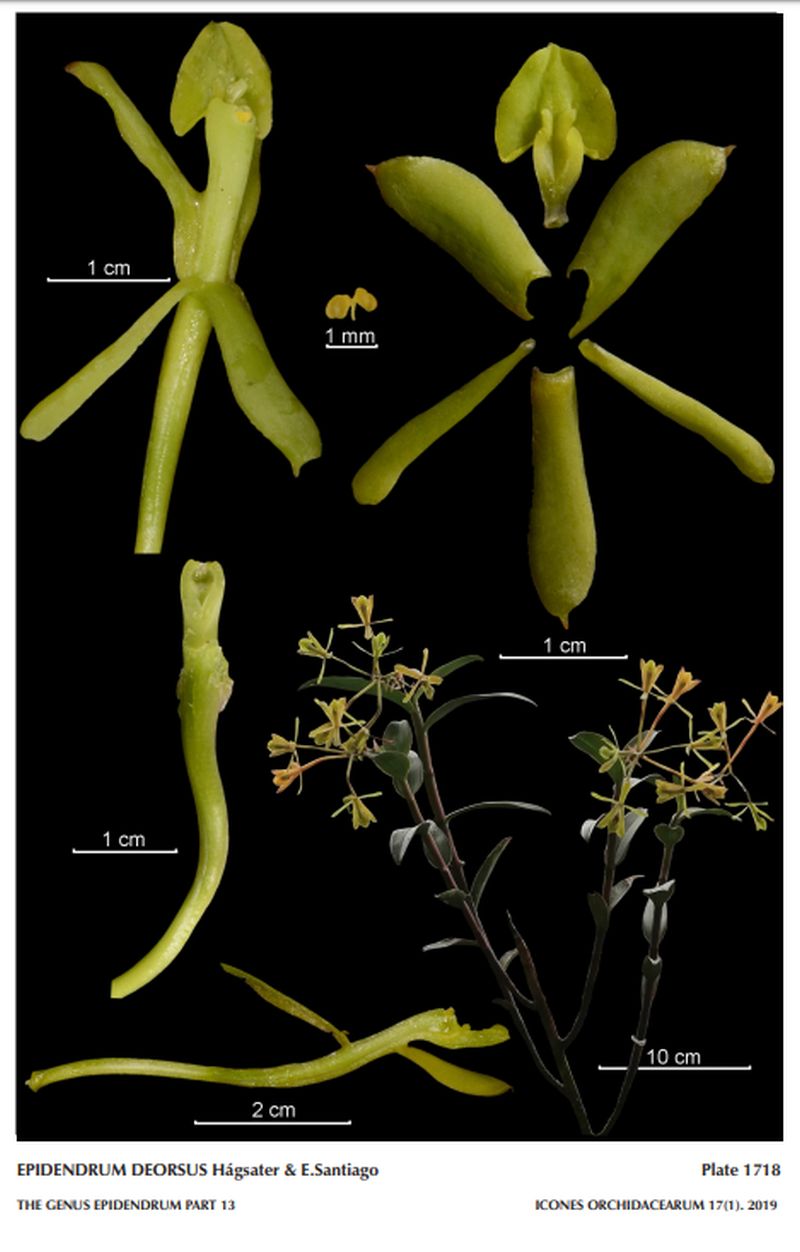 "Epidendrum deorsus belongs to the GROUP Andean SUBGROUP Vernixium which is characterized by the monopodial, sub-apical branching habit, erect inflorescences, lax, non-resupinate flowers, and the lip entire to 3-lobed. The new species is recognized by the ovate-elliptic leaves, short inflorescence, the non-resupinate, horizontally spreading flowers on an ovary 1.6" [40 mm] long, the lip always facing downwards, sepals .84" [21 mm] long, and especially by the entire, cordiform lip .4 x .4" [10 x 10 mm], with a single wide, thickened midrib that reaches the apex of the lip. Epidendrum elatum C.Schweinf. widespread from Bolivia to Colombia has ovate-oblong to elliptic-lanceolate leaves, flowers non-resupinate but upright, but a lip deeply 3-lobed, disc with 3 narrow ribs, lateral lobes of the lip dolabriform with radiating thickened veins. Epidendrum citrochlorinum Hágsater & Dodson from Ecuador has shorter ovaries, .88" [22 mm] long, smaller flowers, sepals .58 to 6.2" [14.5 to 15.5 mm] long, an entire, reniform, cordate lip 3.52 x .58" [8.8 x 14.5 mm]. Epidendrum chaoticum Hágsater & E.Santiago has the ovary 1.2" [30 mm] long, successive flowers non-resupinate, erect, sepals .8" [20 mm] long, lip .48 x .4" [12 x 10 mm], sub-quadrate, calli narrow, elongate, curved, surrounded by 6 short thickened radiating veins." Hagsater etal 2019