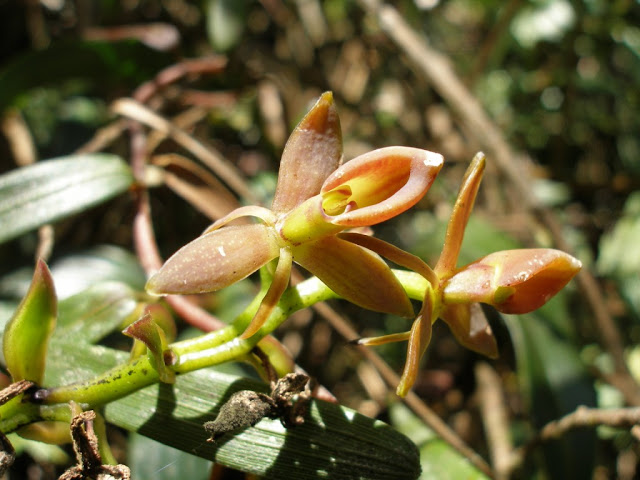 "Epidendrum dermatanthum belongs to the GROUP Macrostachyum SUBGROUP Macrostachyum , which is characterized by the monopodial plants with sub-apical branching, rugose leaf sheaths, large leaves generally spreading, racemose, erect inflorescence, and fleshy flowers generally green to black (ripe olive colored), as well as yellow to pink to purple, with an entire, conduplicate, generally ecallose and pubescent lip embracing the column, and the nectary pubescent to papillose in front of the stigmatic cavity and at least at the base of the lip. The species is recognized by the large, linear-oblong leaves 3.4 to 7.2" x .68 to 1.6" [8.5-18 x 1.7-4 cm], the inflorescence 4.4 to 5.6" [11 to 14 cm] long with the rachis straight, flowers successive, reddish brown, sepals .6 to .72" [15 to 18 mm] long, spreading, with the apex acuminate. Epidendrum bangii Rolfe has lanceolate leaves 2 to 5.6" x .6 to .96" {5 to 14 x 1.5 to 2.4 cm], lax, few-flowered inflorescence, rachis slightly flexuous, petals linear, oblique. Epidendrum rostrigerum Rchb.f. has shorter, oblong-elliptic leaves 1 to 3.6" x .44 to 1.2" [2.5 to 9 x 1.1 to 3 cm], a 3.6" {9 cm] long inflorescence, flowers green tinged with reddish, sepals .4" [10 mm] long, the dorsal one spreading and the lateral ones partly spreading, the anther has a rostrate apex which extends beyond the apex of the column. Epidendrum probosantherum Hágsater has green flowers with purple spots, sepals .4 to .48" [10 to 12 mm] long, the apex acute, the lip deltate and the anther also long, rostrate. Epidendrum chondrochilum syn Epidendrum macrostachyum Lindl. has lanceolate-elliptic leaves 3 to 5.2" [7.5 to 13 cm] long, a pyramidal inflorescence 6.4 to 12" [16 to 30 cm] long, with dark olive-brown flowers, sepals .44 to .46" [11.0 to 11.5 mm] long, and apically sub-obtuse." Hagsater etal 2015