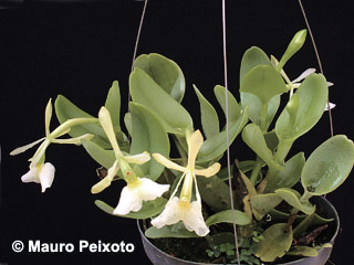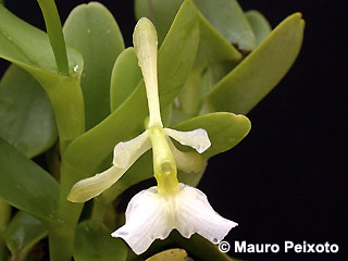 Found in Bahia state of Brazil at elevations around 50 meters as a miniature sized, hot growing epiphyte found on cacoa tree trunks in partial shade with simple, laterally compressed, erect to somewhat flexuous stems carrying 2 to 4, ovate, bilobed, green leaves that blooms in the fall and winter on an apical, sessile inflorescence with shorter than the ovary, triangular, acute floral bracts carrying 1 to 2, simultaneous, resupinate flowers with an intense, sweet fragrance at night and sunup.