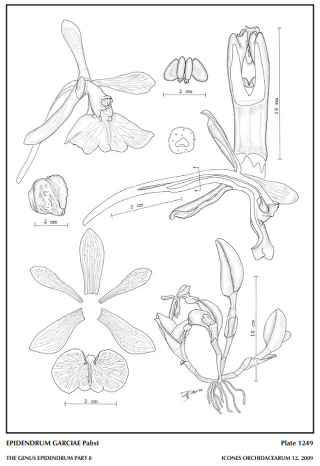 "Epidendrum garciae belongs to the GROUP Difforme which is characterized by the caespitose, sympodial plants, fleshy, pale green to glaucous leaves, apical inflorescence, sessile, rarely with a short peduncle, one-flowered to corymbose, without spathaceous bracts, fleshy, green to yellowish-green rarely white flowers. The species can be recognized by its laterally compressed stems, single-flowered inflorescence, very sweetly fragrant flower at night and sunup, sepals and petals greenish-white, column green, lip white, spatulate petals, transversely oblong, 3-lobed lip, lateral lobes semi-elliptic, midlobe shorter than the lateral lobes, emarginate forming two semiorbicular lobes, column somewhat arcuate. Frequently confused with Epidendrum latilabrum Lindl., another Brazilian species, which has 2 to 4, green flowers, lip four times broader than long. Epidendrum althausenii A.D.Hawkes from Amazon basin has 1 to 3, green flowers, a sub-quadrate lip, and prominent clinandrium-hood." Hagsater etal 2009