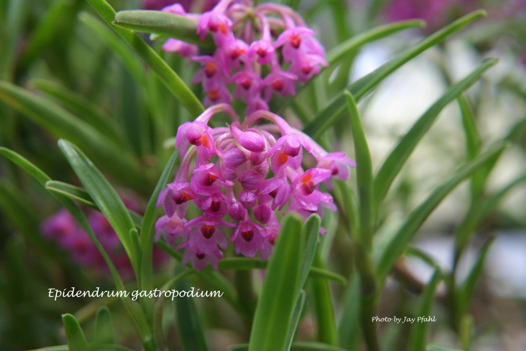 "Epidendrum gastrochilum belongs to the GROUP Diothonea SUBGROUP Gastropodium which is characteri zed by th e branching plants, linear lanceolate to oblong, bilobed leaves, racemose, arching-nulant inflorescence, membranaceous, rarely fleshy flowers, the entire to 3-lobed, ecallose lip with the margin erose with or without 1 to 10 thin, smooth to erose keels, the column completely to obliquely united to the the reniform anther. The species has acute floral segments and the concave lip has prominent transverse cushion ending in three short keels, the flowers are pink-purple. It is similar to Epidendrum eugeneii Schltr. where the lip has three, narrow low keels which do not form a transverse cushion, and reach nearly the apex of the lip. Epidendrum mesogastropodlum Hagsater & Dodson has ovate-elliptic, subacute sepals, and the cushion of the lip truncate." Hagsater etal 2006
