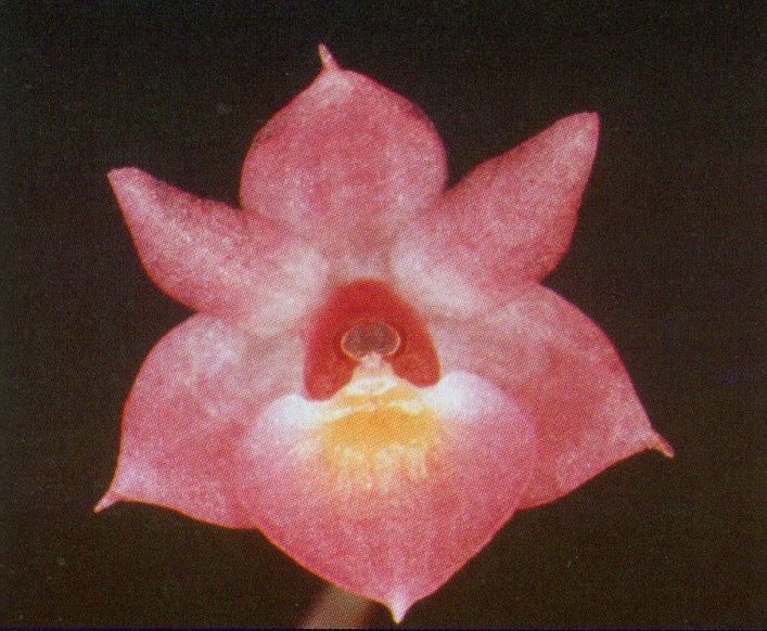 Found in southern Colombia and Ecuador in cloud forests at elevations of 1500 to 3400 meters as a small sized, cool to cold growing epiphyte or occasional terrestrial on steep banks with erect, cane-like, often branched stems enveloped by long, tubular sheaths and carrying stiff, narrowly ovate, apically emarginate, distichous, basally clasping leaves and blooms at most any time of the year on a terminal, short, to .8" [2 cm] long, racemose, corymb-like inflorescence with 9 to 12, simultaneously opening, flowers.