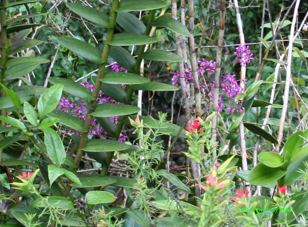 "Epidendrum leave Lindl. (syn.: Epidendrum ionodesme Schltr., Santiago & Hágsater 2010a) belongs to the 1844 GROUP Pseudepidendrum which is characterized by caespitose plants, cane-like stems, acute to acuminate leaves, usually apical inflorescence, the mostly filiform petals and the lip usually 3-lobed with 3 parallel fleshy keels, the apical lobe often bifurcate, the “bird-wing” type pollinia, at least the inner pair, and 1844 SUBGROUP Paniculatum which has flowers colored reddish orange, deep purple or lilac-pink, the calli generally prominent, sometimes horn-like. The species has the lateral lobes of the lip dolabriform-trapezoid, the width of the lip equal in width between the lateral lobes and the mid-lobe, the mid-lobe is deeply emarginate at the apex and forms a pair of linear-oblong, divergent lobes, the column is short, .32 to .36" [8 to 9 mm] long. Epidendrum hypoporphyerum is recognized by the oblong-elliptic leaves, ventrally tinged with purple; the purple-rose flowers with the disc of the lip cream-colored, sepals .44 to .64" [11 to 16 mm]long; the lateral lobes of the lip are trapezoid, somewhat falcate, the basal margin somewhat involute, the mid-lobe widely triangular, widely emarginate, margin entire, spreading, forming a pair of oblong, divergent lobes, the apices rounded. It is similar to Epidendrum porphyreum Lindley which has similar plants, but the leaves are somewhat wider .6 to 1.6" [1.5 to 4 cm], green and concolor; the lateral lobes of the lip are ovate-dolabriform, and the mid-lobe widely deltoid, divided into a pair of triangular lobes." Adapted from Plate 1441 Hagsater etal 2013