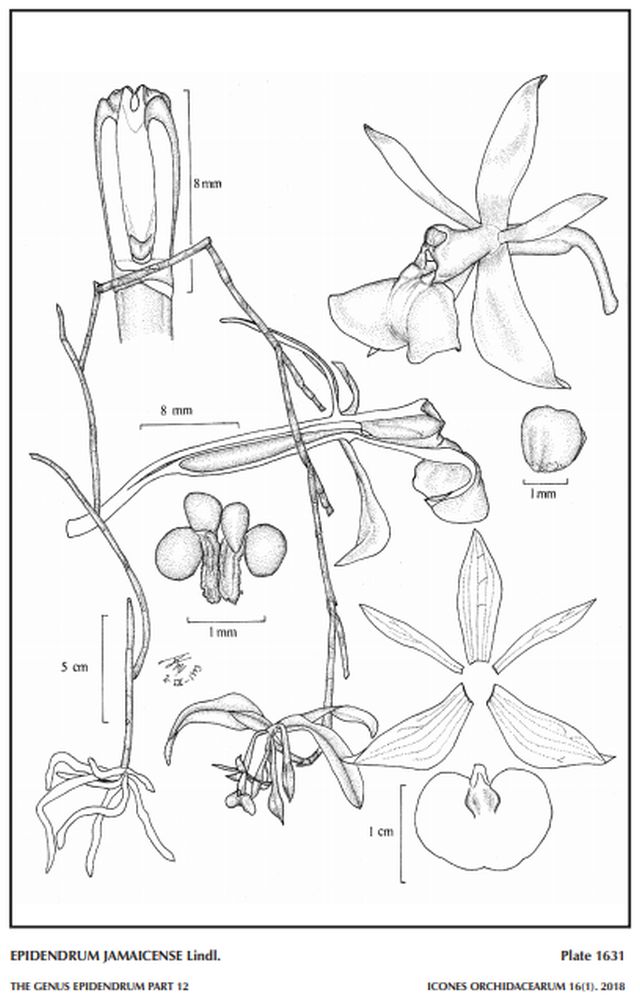 "Epidendrum jamaicense belongs to the GROUP Arbusculum SUBGROUP Incomptum which is characterized by the successive lateral growths produced from the middle of the previous growth, few leaves aggregate towards the apex of the stems, a short apical inflorescence with fleshy greenish to violet-green flowers with short ovaries, the lip entire to 3-lobed, and the Proligerum Complex, which has the ovary inflated, forming a vesicle behind the perianth. The species is recognized by the sub-coriaceous leaves, the successive flowers with a prominent ventral nectary which inflates the ovary over two-thirds its length, acute petals, reniform, bicallose lip, straight column, narrow, and the enormous stigmatic cavity which occupies the whole length of the column. Epidendrum ochrochlorum Barb.Rodr. is green and has larger flowers, sepals .56 to .6" [14 to 15 mm] long, acute, the lip is very similar in shape, the base cordate, with the mid-lobe of the lip emarginate and thus bilobed, but the sides of the lip are obliquely revolute, so that in natural position it looks triangular. Epidendrum proligerum Barb.Rodr. is also larger, with the sepals .48 to .52" [12 to 13 mm] long, has the mid-lobe of the lip entire, not emarginate, with the base of the lip cuneate. Epidendrum morganii Dodson has a widely cordiform, entire lip, sepals .52 to .72" [13 to 18 mm] long, and single veined petals. " Hagsater etal 2018