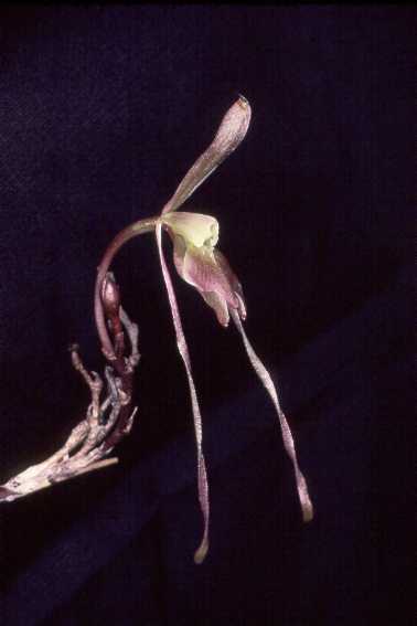 This is a Mexican mini-miniature sized, cool to cold growing epiphytic and sometimes lithophytic species from the northwestern Gulf coast mountains where it occurs in cloud and oak forests at elevations of 1700 to 2200 meters with short, gradually widening stems enveloped by tubular, scarious sheaths and carrying 2 to 3 apical, elliptic to ovate, basally clasping leaves and flowers throughout the year on a terminal, long-pedunculate, 20 to 30" [50 to 75 cm] long, erect to arcuate, racemose inflorescence arising on mature or maturing pseudobulbs in the late winter subtended by many elliptic bracts with one to two successive flowers that open one at a time.