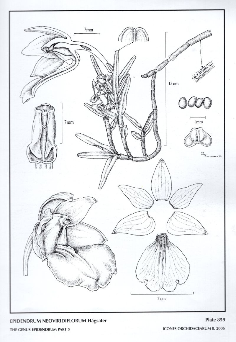 "Epidendrum neoviridiflorum belongs to the GROUP Diothonea SUBGROUP Diothonea which is characterized by the branching plants, linear-lanceolate to oblong, bilóbed leaves racemose, arching-nutant inflorescence, membranaceous, rarely fleshy flowers, the entire to 3-lobed, ecallose lip with the margin erose with or without 1 to 10 thin, smooth to erose keels, the column completely to obliquely united to the lip, the anther reniform. The species has a 1.8 to 2.6" [4.5 to 6.5 cm] long inflorescence, green or burgundy red flowers, an entire, ovate-suborbicular lip, apically 4-lobed, and 3 to 5 long laminar keels at the base [running down the lip, the middle keel reaching about 3/4 of the lip], the lateral ones much reduced, a prominent column-foot, not involute, without forming a sac and leaves .24 to .56" [6 to 14 mm] wide, the column with a pair of involute wings Epidendrum gratissimum (Rchb.f.) Hágsater & Dodson, has a inflorescence 2 to 2.8" [5 to 7 cm] long, a subreniform, apically 4-lobed lip with 3 to 5, long, laminar, erose keels usually short, and the lip obliquely united to the column, with a prominent column-foot not Involute without forming a sac Epidendrum Iloense (Lindl.) Hágsater & Dodson has the inflorescence 2 to 4.8" [5 to 12 cm] long, a subreniform lip with 5 smooth or rarely serrulate keels that form a convex structure at the base of the lip and the column with a very próminent column-foot forming a sac and without involute wings. Epldendrum orthopterum Hagsater & E.Santlago has a short inflorescence just .8" [2 cm] long, a 3-lobed lip with 7 erose keels, and the column wlth a palr of straight, non involule wings." Hasgsater etal 2006