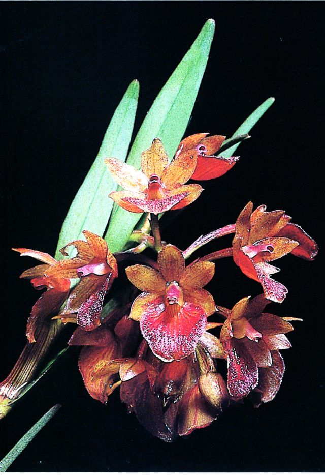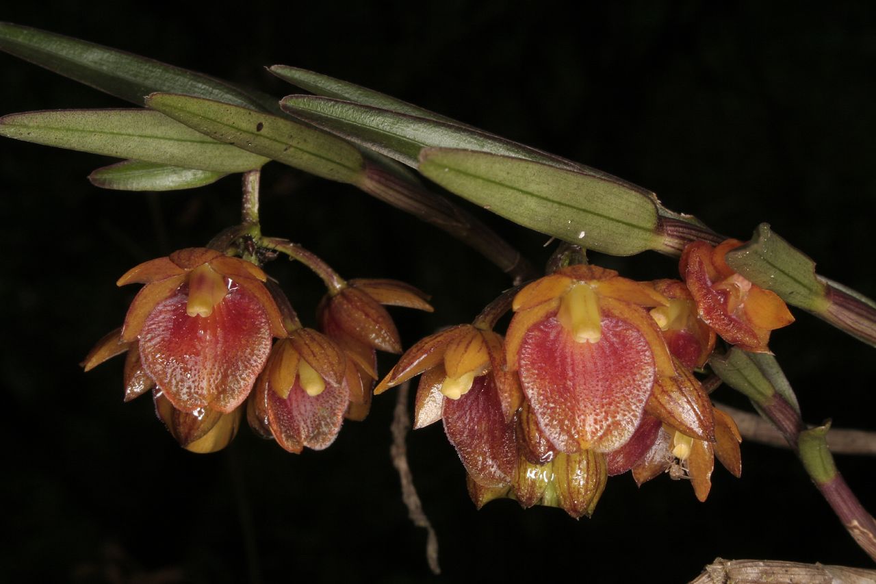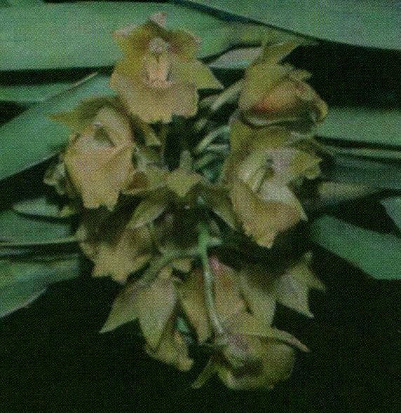 Found in Ecuador on the western slopes of the Andes at elevations of 1800 to 3400 meters as a medium to large sized, cool to cold growing epiphyte or terrestrial with cane-like, terete stems arising out of the apex of the previous stem and carrying 15 to more, alternate, suberect, coriaceous, lanceolate, bilobed apically, slightly crenulate towards the apex, leaves attached to striated, tubular, rugose sheaths that blooms in the late winter and early spring on a terminal, arching-nutant, racemose, terete, short, 13 to 18 flowered inflorescence with lanceolate, acuminate floral bracts that are shorter than the ovaries and carry simultaneously opening, resupinate flowers.