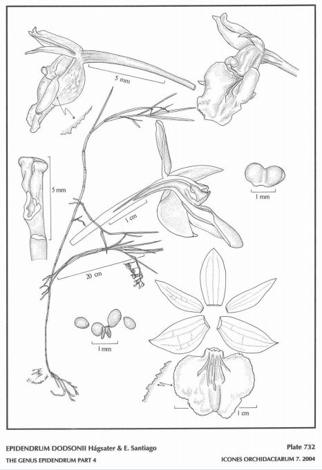 "Epidendrum dodsonii belongs to the GROUP Diothonea SUBGROUP Diothonea which is characterized by the branching plants, linear lanceolate to oblong, bilobed leaves, racemose, arching-nutant inflorescence, membranaceous flowers (rarely fleshy), the entire to 3-lobed, ecallose lip with the margin erose with or without 1 to 10 thin, smooth to erose keels, the column completely to obliquely united to the lip, the anther reniform. The new species is recognized by the thin stems, linear-lanceolate leaves less than .2" [5 mm] wide, successive flowers on a 2 to 2.8" [5 to 7 cm] long inflorescence, sepals .28 to .304" [7.0 to 7.6 mm] long, petals narrowly ovate with entire margin, and the lip united to the arched column provided with 5 keels. It keys out next to Epidendrum dolichorhachis Hágsater & Dodson, which has thicker stems, wider leaves .16 to .48" [4 to 12 mm], simultaneous, larger flowers with sepals .32 to .48" [8 to 12 mm], oblong petals, the keels of the lip are erose, the column forms a short arch at the base and then the upturned apex makes it sigmoid dorsally. Epidendrum trachysepalum from Peru, also has thin stems and narrow long leaves, but it has a short 1" [2.5 cm] inflorescence, simultaneous flowers, .38 to .44" [9.5 to 11 mm] long sepals, strongly uncinate dorsally, petals linear to linear-lanceolate, the margin minutely erose and the lip united obliquely to the column and forming a prominent sac at the base. Epidendrum cochabambanum Dodson & Vásquez known from Bolivia, Peru, Ecuador and Colombia, has still narrower, long leaves to .1" [2.5 mm] wide, a short inflorescence .8 to 1.4 [2 to 3.5 cm], dorsally granulose sepals, linear-elliptic petals, the union of the column and the entlre lip form a sac, and the column is provided with a pair of square corners near the base of the sides that unite it to the lip. Epidendrum microdiothoneum Hágsater & Dodson has much shorter leaves, to 2.2" [to 5.5 cm], a glomerulose inflorescence, with simultaneous, small flowers with a strong odor of fresh pears, the ovary inflated ventrally along 2/3 of its length, elliptic petals and the lip united obliquely to the arched column." Hagsater etal 2004