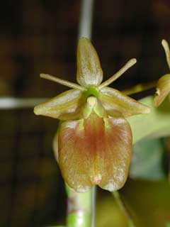 Found in Cuzco departement of Peru in damp, high altitude forests with a dry season from May through December at elevations around 2800 to 3150 meters as a small sized, cold growing epiphyte with curved, spreading, lightly complanate stems enveloped basally by close, tubular, scarious sheaths with and without articulated basal leaves and carrying oblong to oblong-elliptic, coriaceous, thick, obtuse, conduplicate below into the clasping base leaves that are minutely bilobed apically and blooms in the winter and spring on a short to 2" [5 cm], somewhat arching, peduncle thin, totally covered by the prominent, coriaceous, obovate, rounded, margin entire, conduplicate spathe, simultaneously 3 to 5 flowered, racemose inflorescence with very small, triangular, acute floral bracts and carrying resupinate, green to greenish brown flowers.