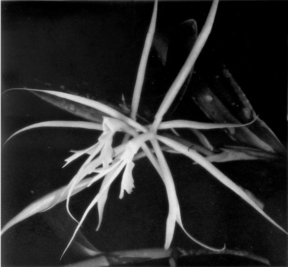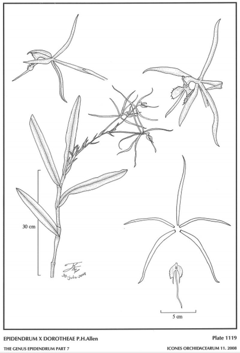 " Epidendrum x dorotheae belongs to the GROUP Coilostylis which is characterized by the sympodial, caespitose plants, the stems forming a fusiform, heteroblastic pseudobulb, with an apical, racemose, distichous inflorescence, the peduncle covered by large bracts (but not spathaceous bracts), and the flowers large, star-shaped, with long, narrow sepals and petals and GROUP Nocturnum SUBGROUP Nocturnum. The species is recognized by the 5 to 12.2" [12.5 to 30.5 cm] long, fusiform pseudobulbs, flowering when immature, the ovary as long as the sepals 2.8 to 3.6" [70 to 90 mm], deeply 3-lobed lip, outer margin of the ovate lateral lobes serrulate to slightly fimbriate; a putative hybrid between E nocturnum and E ciliare two widely distributed species. Epidendrum nocturnum has cane-like, terete stems, 4 to 12 leaves distributed throughout the apical 2/3 of the stem, successive flowers produced one at a time, and slightly smaller, with the margins of the lip entire, the inflorescence is very short, without bracts on the peduncle. Epidendrum ciliare flowers from the mature fusiform pseudobulb, with 2 to 13 flowers, the outer margin of the lateral lobes of the lip deeply fimbriate. Epidendrum oerstedii Rchb.f. also 2 flowers from the immature growth, but the margins of the lip are entire, and the midlobe of the lip is widened in the middle." Hagsater etal 2008