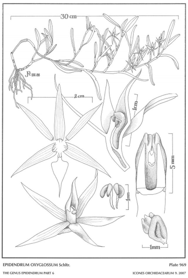 "Epidendrum oxyglossum Schltr. belongs to the GROUP Ramosum which is characterized by the monopodial, branching stems, the spike-like, dístichous inflorescence, and the single callus and the SUBGROUP Rugosum which has few-flowered inflorescence from short, secondary stems, the leaf-sheaths rugose. The species can be recognized by the flexuous main stem with ancipitose sheaths, narrow, oblong-elliptic leaves, single flowered inflorescence, .6 to .8" [15 to 20 mm] long, narrowly lanceolate, acuminate sepals and the long acuminate, ecallose lip with evident thickened veins. It is somewhat similar to Epidendrum lancilabium Schltr. which has very narrow, semiterete leaves, .32 to .36" [8 to 9 mm] long sepals." Hagsater etal 2007