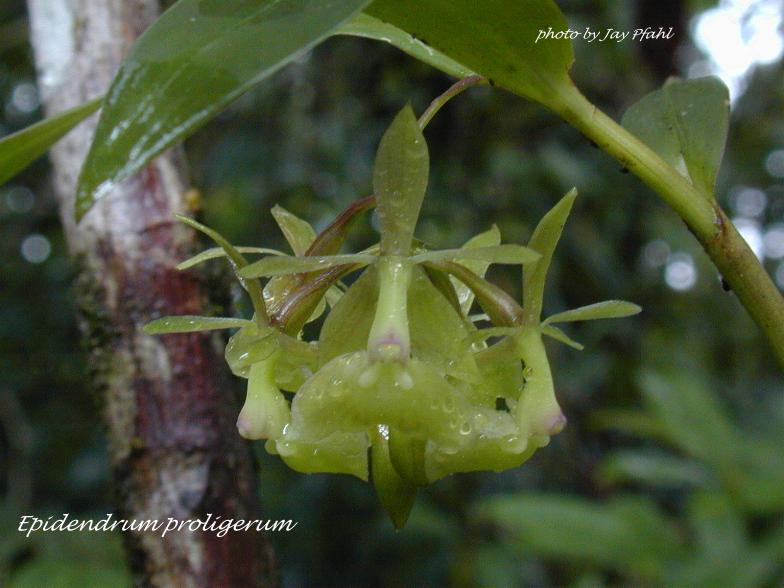 Epidendrum proligerum is part of GROUP Arbuscula SUBGROUP Incomptum characterized by the successive lateral growths produced from the middle of the previous growth, few leaves aggregate towards the apex of the stems, a short apical inflorescence with fleshy greenish to violet-green flowers with short ovaries, the lip entire to 3-lobed. The species Epidendrum janeirense Porto & Brade 1940 and E ecostatum are said to be a synonym of this species but pending better references I have kept them separate.