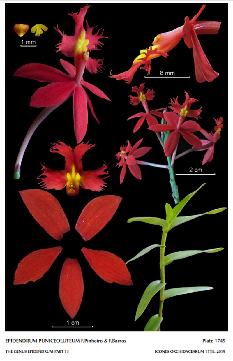 "Epidendrum puniceoluteum belongs to the GROUP Secundum SUBGROUP Secundum which is characterized by the caespitose habit, erect, simple, cane-like stems, a normally elongate peduncle of the inflorescence, an erect raceme of generally resupinate, showy, colorful flowers, and a lip adorned by two calli and a median narrow keel. This species, from the southern coast of Brazil, is recognized by the non-resupinate, bright red flowers with yellow calli and mid-rib; sepals .44 to .72" [11 to 18 mm] long, petals elliptic, relatively wide; the deeply 3-lobed lip; the calli linguiform, ascendant, slightly divergent, low, with a prominent mid-rib, laminar, reaching the middle of the isthmus of the mid-lobe; lateral lobes sub-quadrate to sub-flabelliform, posterior margin entire, distal margins deeply laciniate; mid-lobe formed by sub-oblong isthmus in the basal half, apical half bilobed, the lobes divergent, sub-quadrate, the distal margin laciniate. Epidendrum x obrienianum Rolfe being the similar color and overall shape, is distinguished mainly by the narrower, oblong petals, and especially by the calli being wide, linguiform, sub-divergent, ascendant. Epidendrum cryptopateras Hágsater & Courtinard, from Martinique, being the same color and overall shape but having slightly shorter sepals and petals (about 13 mm long), is distinguished mainly by the calli which are narrow, laminar, parallel, erect, semi-elliptic." Hagsater etal 2019