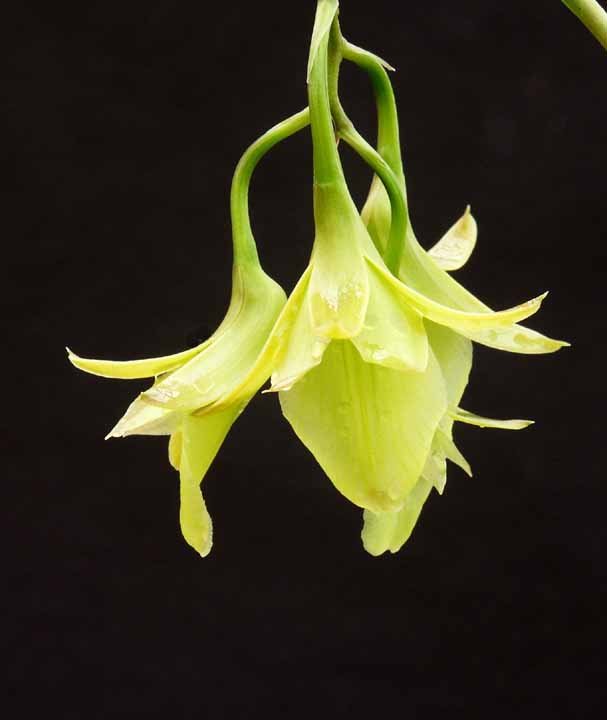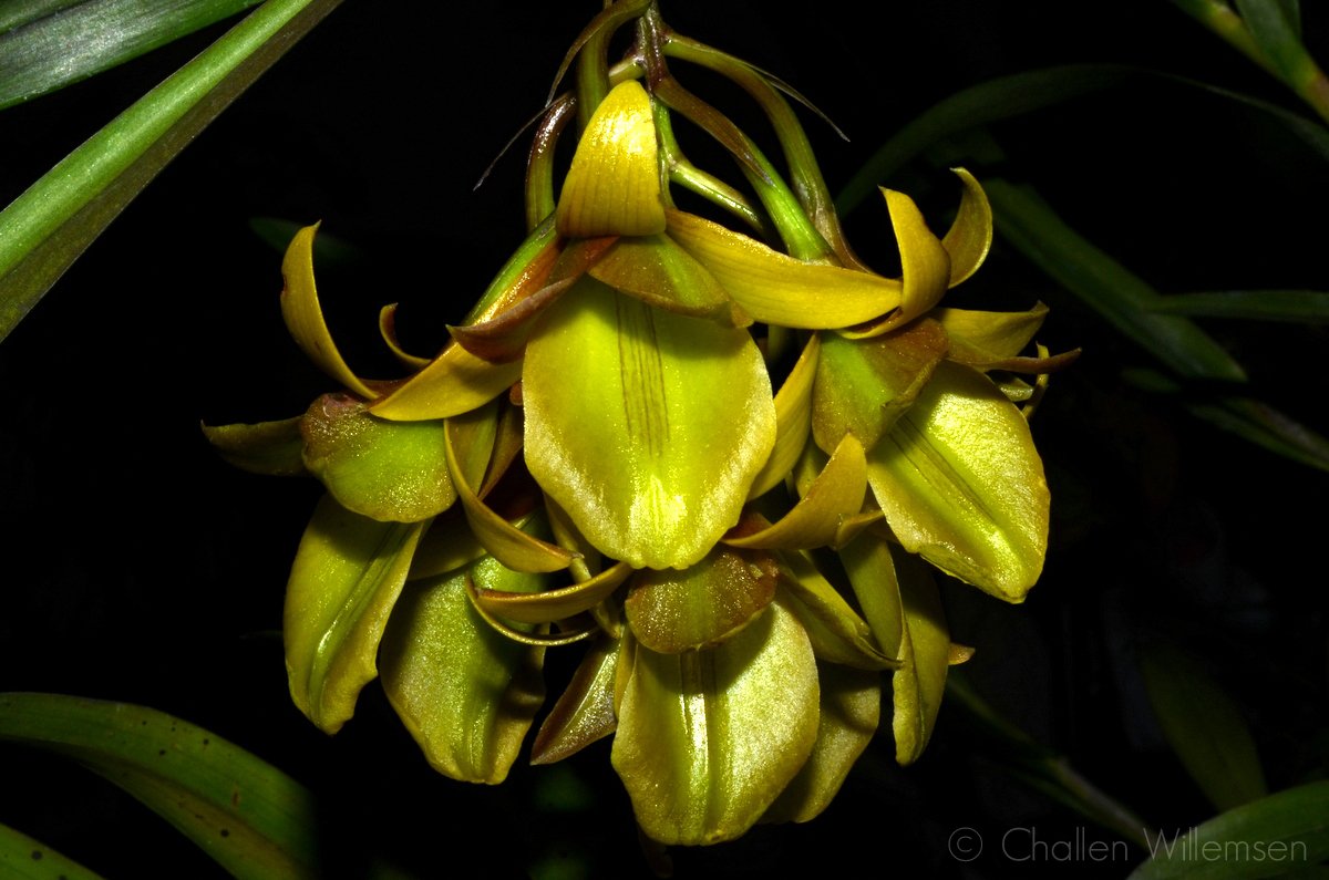 Found in southern Mexico and Guatemala at elevations of 1750 to 2800 meters as a medium sized, cool to cold growing epiphyte with simple, cane-like, basally terete, laterally compressed above stems enveloped in the basal half by tubular, scarious sheaths and carrying 5 to 7, along the upper half, articulate, distichous, ascending, linear-lanceolate, acute, coriaceous, green to purple green, margin entire, spreading leaves that blooms in the winter on a terminal, occuring only once, racemose, arching-nutant, short, 4 to 6 flowered inflorescence with prominent, nearly as long as the ovary, narrowly triangular, long-acuminate floral bracts and carries simultaneously opening flowers.