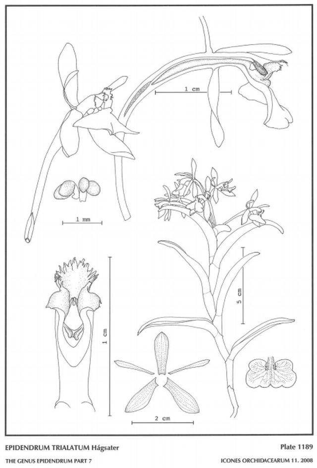 " Epidendrum trialatum belongs to the GROUP Difforme which is characterized by the caespitose, sympodial plants, fleshy, pale green to glaucous leaves, apical inflorescence, sessile, rarely with a short peduncle, single flowered to corymbose, without spathaceous bracts, fleshy, green to yellowish-green, rarely white flowers. The species can be recognized by the laterally compressed stems, narrowly elliptic to ligulate leaves, 3 to 6, greenish white flowers, single veined petals, a rectangular-reniform lip, and especially the apex of the column with 3, dentate-fimbriate petaloid processes. Epidendrum firmum Rchb. r. has more delicate plants, smaller, greenish flowers, and a 3-lobed lip with a quadrate midlobe." Hagsater etal 2010