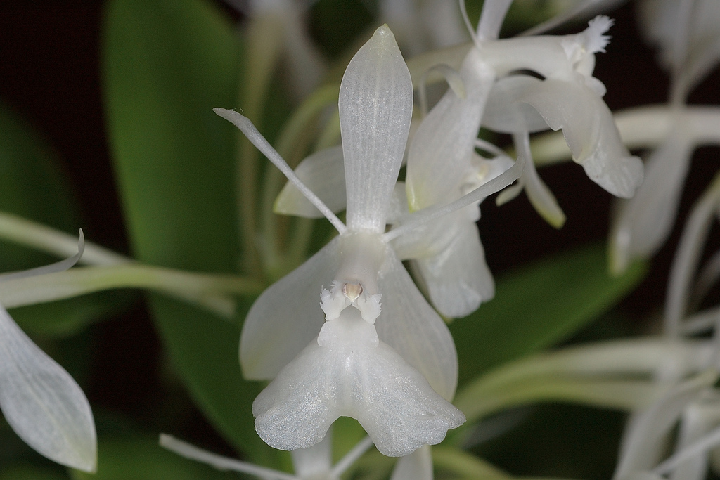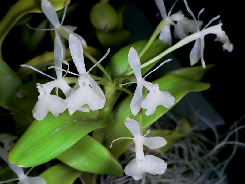 Found in Nicaragua, Panama and Costa Rica in rain and semi-deciduous forests at elevations of 50 to 1000 meters as a miniature to small sized, hot to warm growing epiphyte with a short, simple, cane-like, laterally compressed, slightly flexous stem enveloped by, elongate, acuminate, loose, scarious sheaths and carrying 4 to 11, coriaceous, all along the stem, narrowly elliptic to ligulate, obtuse to retuse, conduplicate and basally clasping leaves that blooms in the fall through spring on a sub-umbellate, arising through an apical spathe, nearly sessile, 1" [2.5 cm] long, racemose, simultaneously 3 to 6 flowered inflorescence with much shorter than the vary, triangular, acute floral brascts and carrying nocturnally very fragrant flowers.