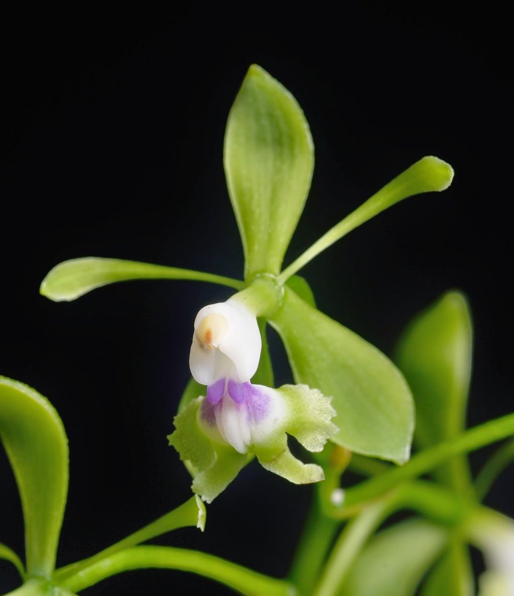 Found in Venezuela, Guyana, French Guiana, Surinam, Brazil and Peru in wet montane forests at elevations of 100 to 300 meters as a medium sized, hot growing epiphyte with simple, cane-like, terete, straight stems enveloped completely by several, imbricate, scarious bracts and carrying 8, distichous, articulate, unequal in size, basally much smaller, green above ventral surface occasionally purple, elliptic to oblong-elliptic, acute, margin entire leaves that blooms in the spring on a terminal, erect, pluri-racemose, successive racemes deveop from the distal bracts of the peduncle, peduncle to 8.8" [22 cm] long, with up to 4, large, tubular, acute, conduplicate bracts, paniculate, to 22" [50 cm] long overall, successively 6 to 8, 16 to 25 many flowered inflorescence with each branch carrying several, spreading flowers with much shorter than the ovary, triangular-lanceolate, acuminate, amplexicaul floral bracts and carrying resupinate, non-fragrant flowers.
