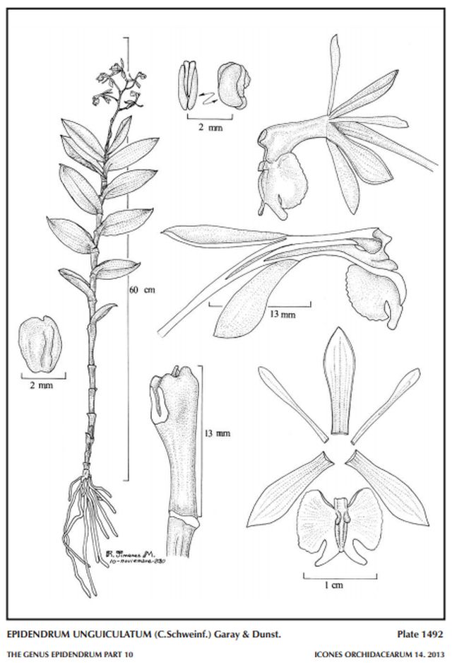 "Epidendrum unguiculatum belongs to the GROUP Pseudepidendrum which is characterized by caespitose plants, cane-like stems, acute to acuminate leaves usually apical inflorescence, the mostly filiform petals and the lip usually 3-lobed with 3 parallel fleshy keels, the apical lobe often bifurcate, the “bird-wing” type pollinia, at least the inner pair, and SUBGROUP Pluriracemosum which has a racemose and few-flowered inflorescence on an elongate peduncle, usually producing new racemes over the years and thus pluri-racemose, the rachis is elongate, and thus lax flowered, the flowers are bicolored, basically green to brown with the lip white to purple, spotted or not. The species is recognized by the lax, few-flowered pluri-racemose inflorescence, the large flowers with the apex of the sepals dorsally papillose .72 to .8" [18 to 20 mm] long, green with the apex of the column and disc of the lip white, the calli frequently tinged purple, especially in the northern populations. It is very similar florally to Epidendrum isthmii Schltr. which ranges along the Atlantic lowlands of Mesoamerica, but that species has a paniculate, simultaneous inflorescence, somewhat smaller flowers, sepals dorsally glabrous, .52 to .6" [13 to 15 mm] long, the calli never tinged purple. Epidendrum pluriracemosum Hágsater & E.Santiago produces pluri-racemose inflorescences with a zigzag rachis, flowers open usually 2 open at one time, smaller, sepals .36 to .42" [9 to 10.5 mm] long, petals linear-filiform, and the mid-lobe of the lip is separated by a very short isthmus, the lip is always immaculate white. Epidendrum huamantupanorum Hágsater & E.Santiago has intermediate sized plants, about 20" [50 cm] tall, narrowly elliptic and short acuminate leaves, the greenish copper sepals .6" [15 mm] long and petals, column base greenish, apical half lavender, the lip hyaline white, the calli and ribs lavender, surrounded by a darker ring, the convex lip with the lateral lobes hemi-elliptic. Epidendrum oenochrochilum Hágsater, Ric.Fernández & E.Santiago has elliptic, acute leaves 1.12 to 2.6" x .4 to 1" [2.8 to 6.5 x 1 to 2.5 cm], purple-brown colored flowers with the lip yellow-brown or dirty pink, the lateral lobes of the lip sub-quadrate. Epidendrum maroniense Hágsater & E.Santiago has somewhat smaller flowers, lateral sepals .664 to .68" [16.6 to 17 mm] long, linear-filiform petals and the lip is transversely rectangular in outline, the base truncate." Hagsater etal 2013