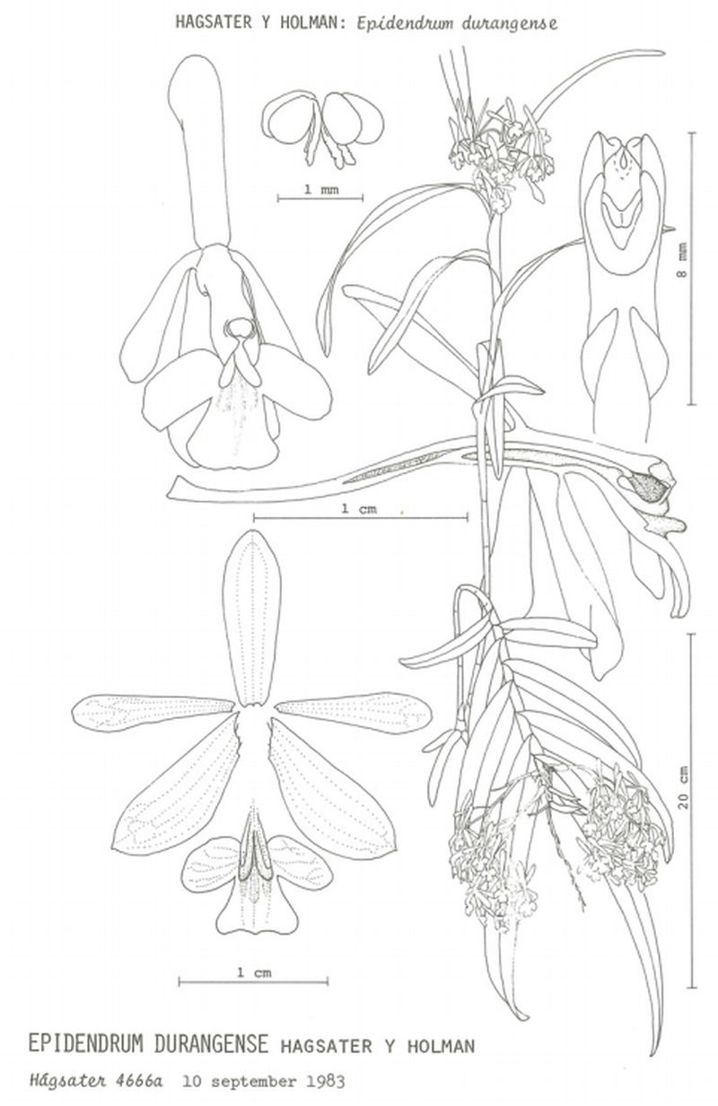 References W3 Tropicos, Kew Monocot list , IPNI ; The Genus Epidendrum Ames 1936; ORQUIDEA (Méx.) 9(2): 1984 as E durangense drawing/photo fide; Flora Novo-Galaciana Vol 16 McVaugh 1985 as E durangense; Orchids of Mexico Hagsater, Soto, Salazar, Jimenez, Lopez and Dressler 2005;