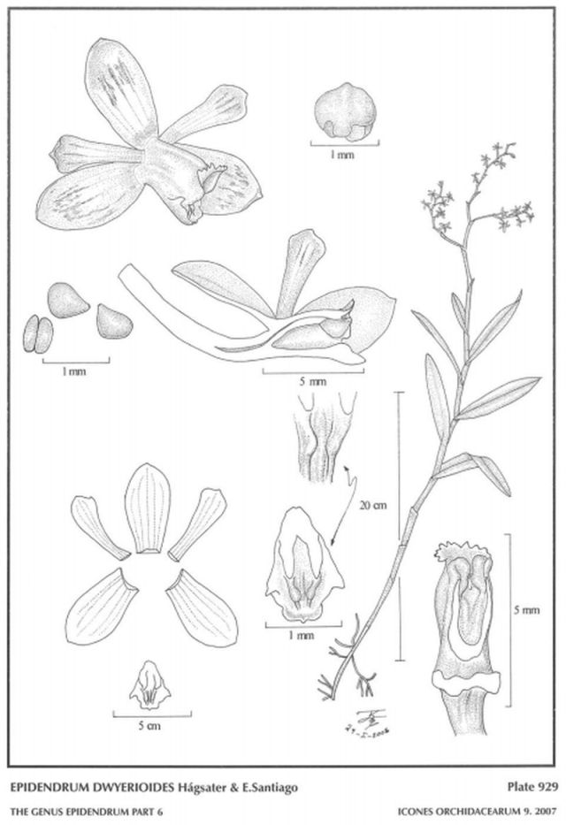 "Epidendrum dwyerioides belongs to the GROUP Neowilliamsia characterized by the ancipitose stems and rachis, the rachis with conduplicate, acute bracts, distichous, non-resupinate flowers, the lip often digitate and the 2 or 4 pollinla with 2 hard, laminar, caudicles. The species is recognized by the paniculate inflorescence with greenish yellow flowers with brown spots, a very reduced subentire, white lip with a pair of trangular lateral lobes, the nectary wide in front of the stigmatic cavity and narrow at the bottom. Epidendrum dwyeri Hágsater has a similar inflorescence but the flowers are larger sepals .28 to .344" [7 to 8.6 mm] long, the lip subentire with the margin trullate to forming 4, short, digit-like lobes. Epidendrum philowercklei Hágsater & Santiago has the lip clearly 3-lobed, with the column and claw of the lip forming a wide aperture and the nectary wide and rounded at the bottom." Hagsater etal 2007