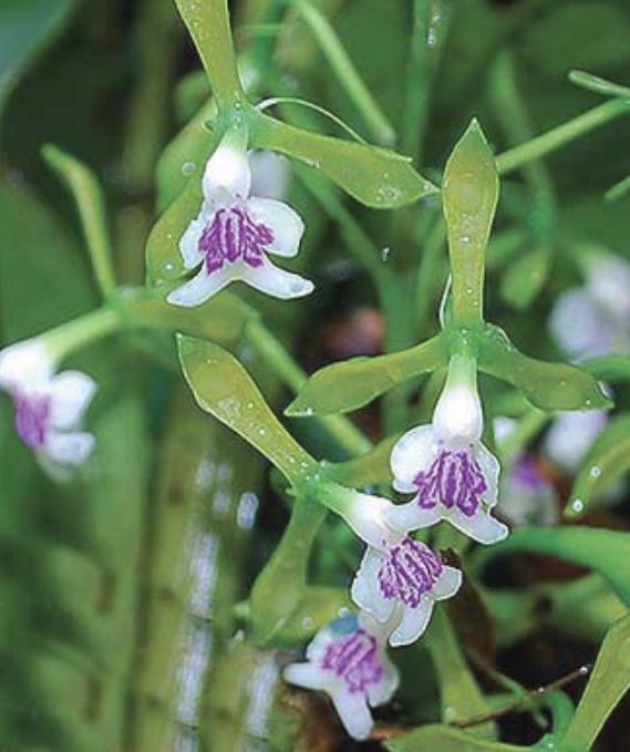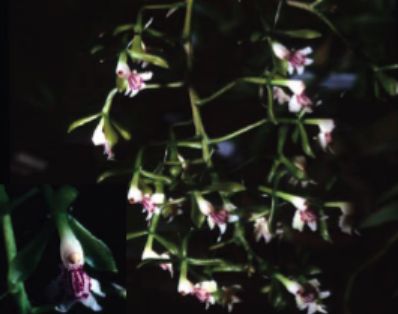 Found in northwestern Bolivia in wet montane forests at elevations of 1500 to 2200 meters as a small to medium sized, cool to cold growing epiphyte with simple, canelike, laterally compressed , ancipitose, arching-pendent stems enveloped basally by tubular, non-foliaceous sheaths and carrying 7 to 13, all along the apical half of the stem, articulate, distichous, unequal in size [the basal are smallest]; oblong-lanceolate, acute, margin entire leaves that blooms in the summer through fall on a terminal, occuring only once, paniculate, arching, peduncle, thin, laterally compressed, 1.2 to 2.4" [3 to 6 cm] long, with 2 to 3 conduplicate, acuminate, ancipitose bracts, rachis with 2 short, spreading racemes, 1.2" [3 cm] long, simultaneously 40 flowered inflorescence that is 3.2" [8 cm] long overall and has shorter than the ovary, linear-lanceoalte, acuminate floral bracts.
