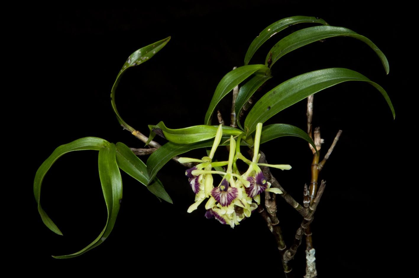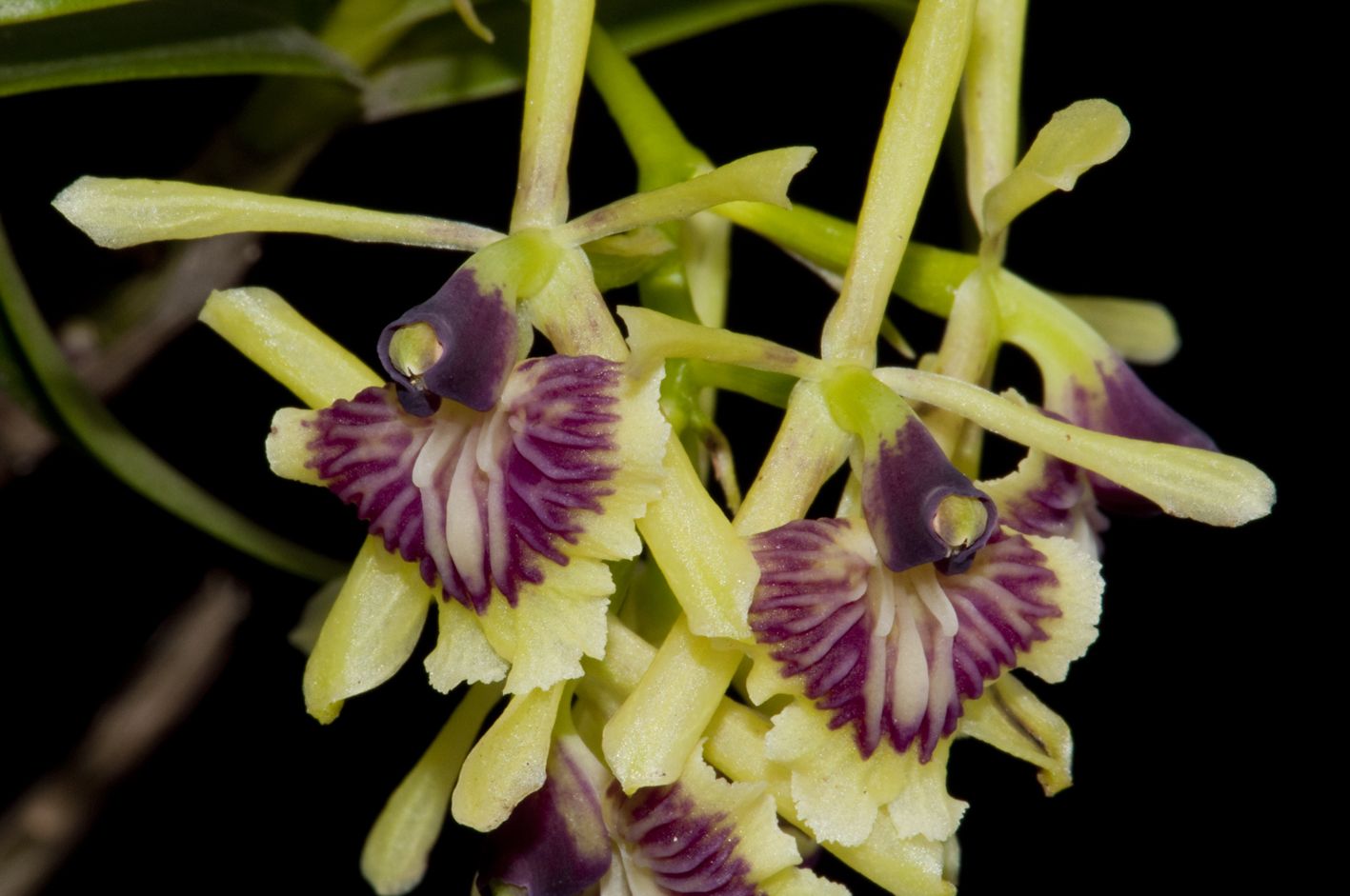 Found in Oaxaca state of Mexico at elevations around 1400 meters as a small sized, cool growing epiphyte with an ascending to diffuse, terete, branched, cane-like, thin, straight stem carrying 2 to 3, towards the apex, articulate, distichous, subcoriaceous, narrowly lanceolate, acute leaves that blooms in the fall on a terminal, arising on a mature stem, occuring only once, racemose, arcuate-nutant, 1.2 to 2" [3 to 5 cm] long including the laterally compressed, straight, .64 to 1.04" [1.6 to 2.6 cm] long peduncle, rachis zig-zag, subspherical, simultaneously 7 to 8 flowered inflorescence with prominent, almost as long as the ovary, narrowly triangular, acuminate, amplexicaul floral bracts