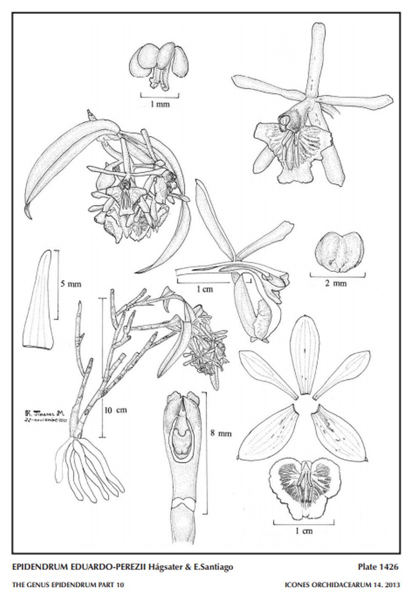 "Epidendrum eduardo-perezii belongs to the GROUP Conopseum which is characterized by the sympodial growth mode, sometimes with branching stems, membranaceous to sub-coriaceous leaves, delicate, relatively small flowers, the lip bicallose, with few to many ribs on the disc of the lip, and the predominantly Mexican SUBGROUP Propinquum which is characterized by the bush-like habit with thin stems, membranaceous leaves, racemose, few flowered compact, inflorescence, and the mostly yellow or pale green flowers. The species is recognized by the short stems with 2 to 3 narrowly lanceolate, fleshy, leaves 1.48 to 2.8" [3.7 to 7 cm] long, green flowers with the apex of the column and the disc of the lip red-purple, with many green radiating thickened-veins. The plant habit is reminiscent of a short Epidendrum skutchii Ames, F.T.Hubb. & C.Schweinf., but that species has up to 48" [1.2 meters] tall plants, the stems are longer and thinner, linear to linear-lanceolate, acuminate leaves 2.2 to 6.8" [5.5 to 17 cm] long, and the flowers are greenish yellow, slightly tinged with purple, it also has radiating ribs on the lip, but not as prominent. The flowers are somewhat reminiscent of Epidendrum radioferens (Ames, F.T.Hubb. & C.Schweinf.) Hágsater, but the plants of that species are taller and more robust, 80" [2 meters] tall, with 2 to 6 elliptic leaves 2.2 to 7.6" to .56 to 2.4" [5.5 to 19 x 1.4 to 6 cm], with intense red-purple colored flowers, the lip transversally revolute and the radiating keels cream to yellow colored. Epidendrum lignosum Lex. 1825 is superficially similar, but the 3 flowers of that species, with low, parallel ribs on the disc, and no prominent radiating ribs, the flowers are also somewhat smaller, sepals .32 to .44 [8 to 11 mm] long; the leaves are fleshy, linear-elliptic." Hagsater etal 2013