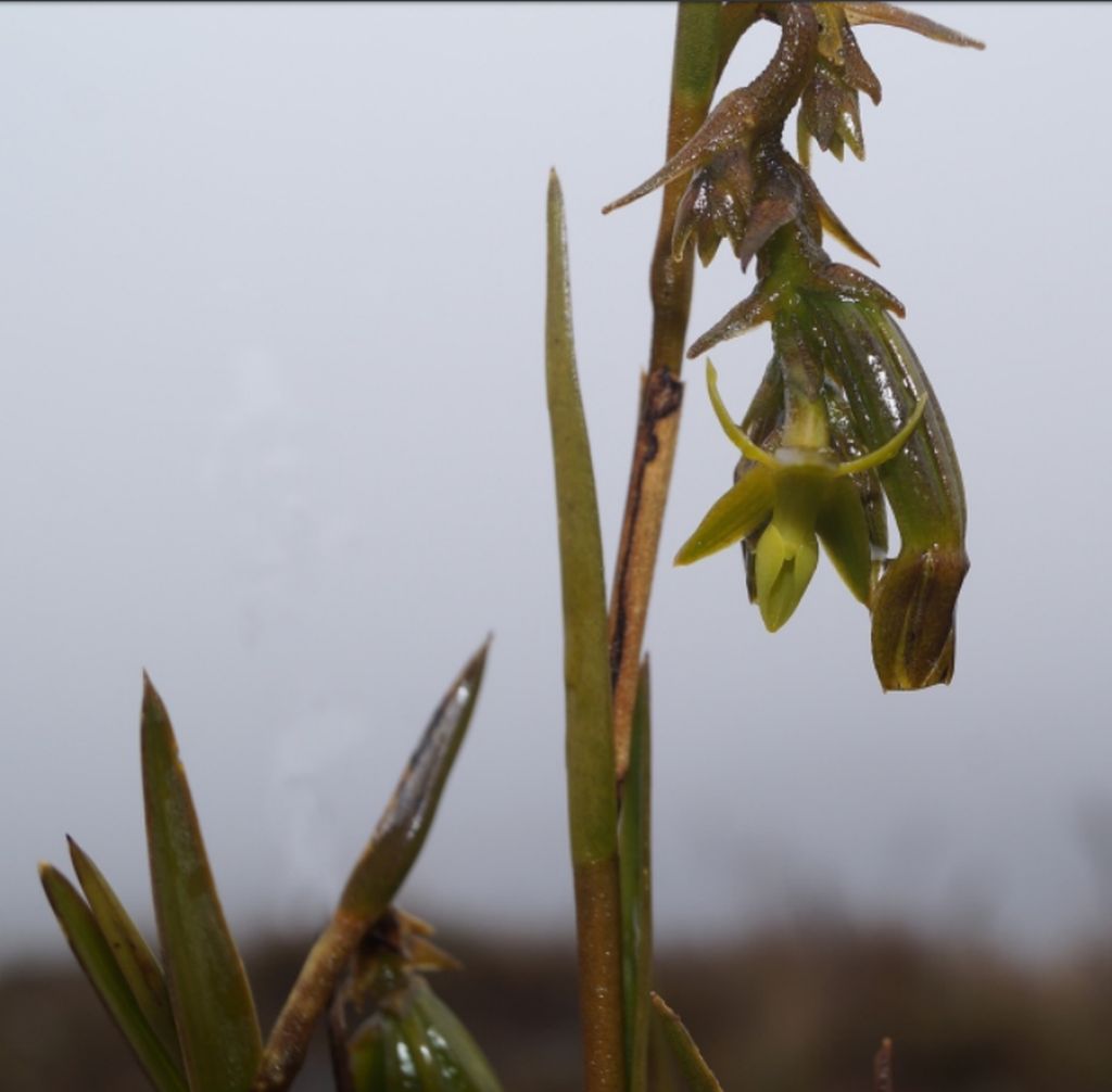 Found in Peru along the eastern side of the Andes, on Andean Tepuis, in pajonal at elevations of 2700 to 3900 meters as a medium sized, cold growing terrestrial with cane-like, terete, thin, erect, straight stems carrying 9 to 12, distributed throughout the stem, parallel to the stem, articulate, distichous, coriaceous, green, concolor, slightly concave, base embracing the stem; tubular, rugose, yellowish green foliar sheath; blade , narrowly lanceolate, acuminate, margin entire, spreading leaves that blooms at least in the summer and fall on a terminal, without a spathe, peduncle .28 to .4" [0.7 to 1.0 cm] long, short, terete, thin but not filiform, papilose, provided at the apex with an embracing, narrowly triangular, acuminate, rugose-papillose bract, 1.6 to 2.68" [4.0 to 6.7 cm] long overall, apical and lateral from mature stems, arching-nutant racemose to paniculate with time, producing dense, short, 5-15 per raceme, arranged in a helicoid around the rachis, successively many-flowered inflorescence with shorter than the ovary, widely triangular, acuminate, embracing, dorsally slightly papillose, greenish brown floral bracts and carrying. yellowish green flowers with the sepals dorsally tinged brown, column and lip greenish yellow, concolor; fragrance none.