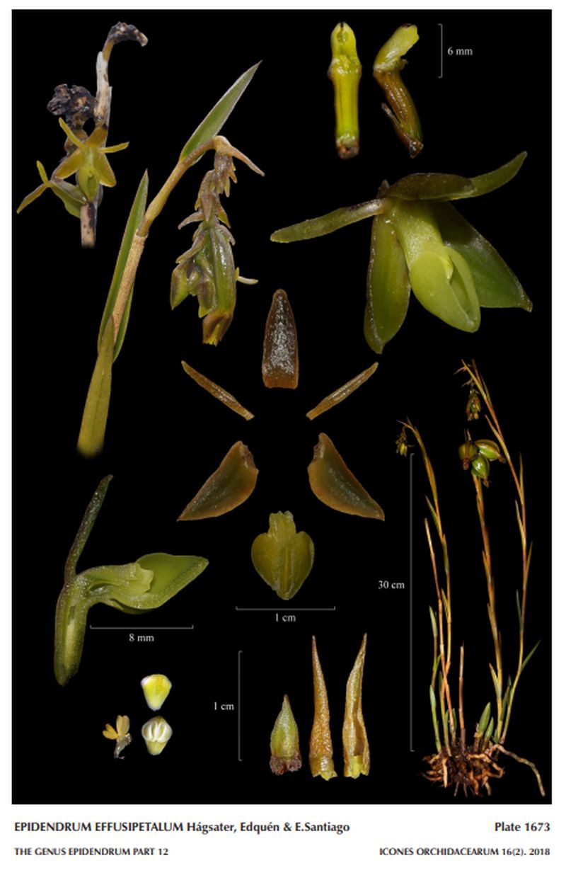 "Epidendrum effusipetalum belongs to the GROUP Frutex recognized by the caepitose habit, usually simple stems, lanceolate leaves, lacking spathes, nutant racemes, widely cordiform to reniform lip and the SUBGROUP Lepthanthum which is caracterized by the thin stems, scarecely branched when mature, leaves short, linear-lanceolate to lanceolate oblong, nearly parallel to the stem, inflorescence arching-nutant, apical and lateral in mature stems, racemose to paniculate, few-flowered. The new species is recognized by the erect leaves parallel to the stem, few, densely-flowered inflorescence, yellowish green flowers, sepals dorsally tinged brown, outstretched petals, lateral sepals triangular-ovate, obliquely united to the base of the column and ecallose, ovate-cordiform lip. Epidendrum leptanthum is vegetatively very similar, but has a lax-flowered inflorescence, petals partly spreading, lateral sepals ovateoblong, free, and lip bicallose forming a “W”, widely cordiform. Epidendrum podocarpense Hágsater & E.Santiago has fuchsia colored flowers, the ventral surface of tepals and lip pink, petals partly spreading, parallel to the dorsal sepal, lateral sepals free, elliptic, and lip bicallose, widely cordiform. Epidendrum choccei M.A.Tarazona, Hágsater & E.Santiago, has pink colored flowers, column and disc of the lip white, petals partly spreading, acute, sepals free, and lip ecallose, widely ovate, base truncate and apex acuminate. Epidendrum stenophyton Schltr. of the GROUP Elleanthoides SUBGROUP Rhombochilum is vegetatively similar, but the floral bracts are acuminate, proportionately longer than wide, sepals and petals are partly spreading, petals .28" [7 mm] long, linear-lanceolate, acuminate, column ca. .12" [3 mm] long, and lip .1" [2.5 mm] long and rhombic-elliptic." Hagsater etal 2018
