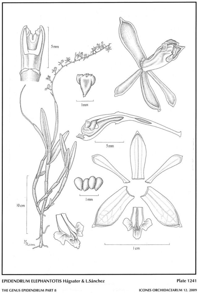 "Epidendrum elephantotis belongs to the GROUP Mancum which is characterized by the sympodial habit, few-leaved stems, racemose inflorescence with 1 to 2 ancipitose, long, spathaceous bracts with parallel sides and the SUBGROUP Mancum has non-resupinate flowers, generally reduced and fleshy lip. The species can be recognized by its 2 to 3 leaved stems, single veined petals, 3-lobed, bicallose lip, the calli larger than the short central keel, and the lateral lobes of the lip dolabriform, oblique, the base rounded the apex acute; midlobe sub-quadrate, apex short emarginate. It is very similar to Epidendrum sarcodes, also from Colombia, but that species has 4-6-leaved stems, large flowers, sepals .28 to .36" [7 to 9 mm] long, 3-veined petals, the lateral lobes of the lip small, semi-circular, entire, the midlobe sub-rectangular, the triangular apex somewhat conduplicate in natural position. Epidendrum sarcoglottis Schltr. from Colombia and Ecuador, has larger leaves 2 to 5.2" x .52 to .88" [5 to 13 x 1.3 to 2.2 cm], an entire, triangular, claw-shaped lip, with a single prominent callus forming a wide, fleshy cushion. Epidendrum violetense Hágsater & Dodson known from Loja, Ecuador, has wider leaves, .52 to .64" [1.3 to 1.6 cm] wide, a reduced, entire lip, with two very prominent calli, occupying 2/3 of the lip, with a short keel in the middle, thus appearing as a thick, 3-lobed structure." Hagsater etal 2009