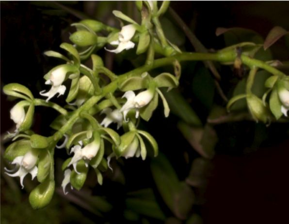 Found in southern Ecuador and northern Peru on the Andean Tepuis of the Sierra del Cutucú, Ecuador and the Cordillera Oriental of Peru, along the border of the Departments of Amazonas and San Martín at elevations of 1106-2400 meters as a just edium sized, cool to cold growing epiphyte with canelike, terete, thin, especially towards the base stems carrying 13, distributed throughout along the apical half of the stem, sub-erect, fleshy basal sheath tubular, somewhat striated when dry, green, blade narrowly-elliptic, acuminate, smooth, margin entire leaves that blooms in the summer and earlier fall on a terminal, peduncle .8" [2 cm] long, terete, thin, short, nearly totally hidden by 2 linear-lanceolate, acuminate, embracing bracts, rachis terete, thin, short, paniculate, 3, densely 5-7 flowered, subtended by a prominent, clasping bract, arching, dense, simultaneously to 20 flowered inflorescence with progressively shorter, somewhat longer than the ovary, linear-triangular, acuminate floral bracts and carrying resupinate flowers.