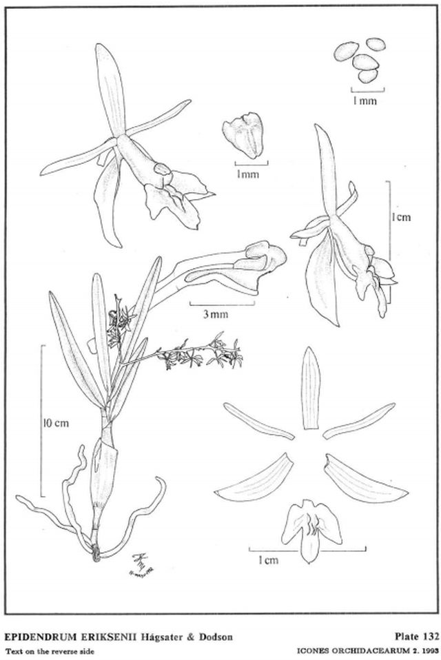 "Epidendrum eriksenii is part of GROUP Amblostoma SUBGROUP Amblostomioides characterized by the caespitose habit, the thinly fusiform stems carrying narrow, apically bilobed, subcoriaceous leaves distributed towards the apical half of the stem that blooms on an often large, apical, erect, paniculate infloresence carrying greenish yellow to white flowers with a 3 lobed lip and with the ovaries and sepals usually dorsally pubescent. The species is closely related to E. purum Lindl. but has much smaller, thickened, pseudobulbous stems and acute (not acuminate) floral segments. The column is somewhat sigmoid when seen together with the ovary, the apex upturned, instead oí being arcuate downwards." Hagsater etal 1993
