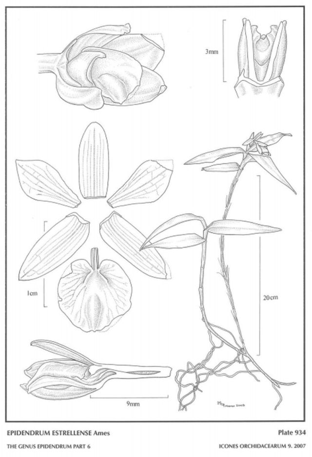 References W3 Tropicos, Kew Monocot list , IPNI ; The Genus Epidendrum Ames 1936; Ceiba Vol 5 No 1 L O Williams 1956; Icones Orchidacearum 3 Plate 310 Hagsater 1999 see recogntion section; Manual de las Plantas de Costa Rica Vol 3 Hammel, Grayum, Herrera and Zamora 2003; Icones Orchidacearum Vol 8 Plate 839 Hagsater & Sanchez 2006 see recognition section; Icones Orchidacearum 9 Plate 924 Hagsater 2007 see recognition section; Icones Orchidacearum 9 plate 934 Hagsater & Sanchez 2007 drawing fide; Icones Orchidacearum 9 Plate 976 Hagsater 2007 see recognition section; Orchids of Costa Rica Vol 3 Morales 2009 photo fide; Icones Orchidacearum 17(1) Plate 1740 Hagsater & Jimenez 2019 see recognition section