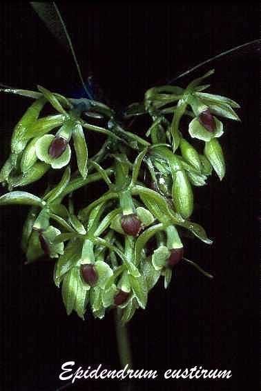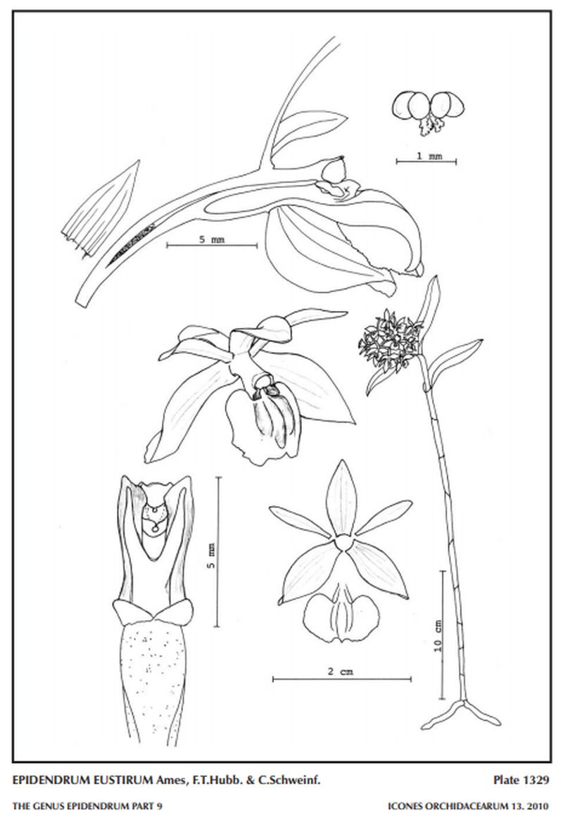 "Epidendrum eustirum belongs to the GROUP Fruticosum characterized by the caespitose to creeping habit, a few subcoriaceous leaves, the racemose to rarely paniculate inflorescence with green to purple tinged flowers and a very fleshy reddish purple disc on the lip consisting of 3 fleshy, thick, rounded keels. The species is recognized by the caespitose, unbranched habit, relatively narrow leaves .16 to .68" [4-17 mm] wide, the green flowers, the disc purple, and narrow, oblanceolate petals .48 to .6"[1.2 to 1.5 mm] wide. It is florally very similar to Epidendrum fruticosum Sessé & Mociño ex Lindl. which has a creeping, bush-like habit, heteromodular, ascending stems by substitution, distal stems diminishing markedly in size, relatively wide leaves, .4 to 1.2" [10 to 30 mm] wide, greenish yellow to intense wine-purple flowers, partly spreading floral segments, apex rounded, widely oblanceolate petals .128 to .192" [3.2 to 4.8 mm] wide, and the reniform lip, the disc with a thickened, fleshy, 5-lobed structure." Hagsater etal 2013