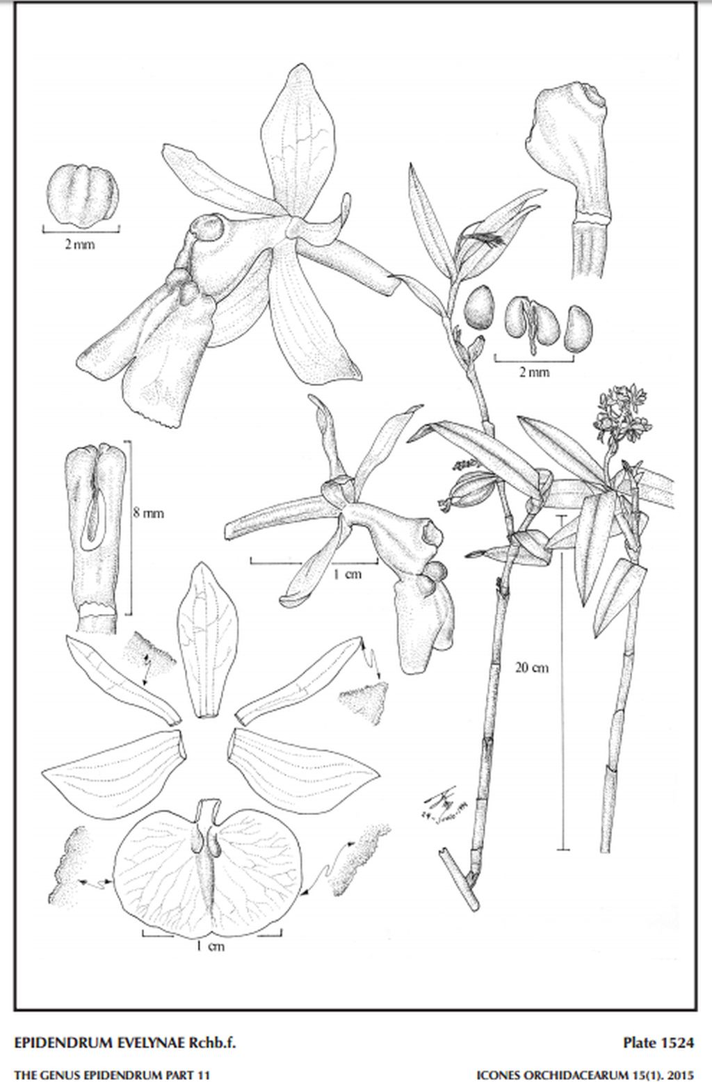 "Epidendrum evelynae belongs to the GROUP Arbuscula which is characterized by the erect habit with successive lateral growths produced from the middle of the previous growth, few leaves aggregate towards the apex of the stems, roots generally only from the base of the primordial stem, and the SUBGROUP Incomptum which has a short apical inflorescence with fleshy yellowish to green to violet-green to black flowers with short ovaries, the lip entire to 3-lobed. The species is recognized by the sub-coriaceous leaves, the successive flowers without any prominent ventral nectary which inflates the ovary, the reniform, bicallose lip, sepals .36 to .44" [9 to 11 mm] long, and the linear, single veined petals. Epidendrum chimantense Hágsater & Carnevali has the purple-tinged leaf-sheaths, narrow, elliptic-lanceolate leaves, the column arching only at the base and a slender, non-inflated ovary. Epidendrum lechleri Rchb. f., a species native to Peru, has .52" [13 mm] long sepals and a 3-lobed lip. Epidendrum nephroglossum Schltr. has very prominent floral bracts equal or longer than the ovary which is not swollen, acute petals and an obsolete clinandrium. Epidendrum bakrense has wider petals and shorter segments, with a much inflated ovary, and the column apex with a rounded lobe above the calli, not a tooth. Epidendrum rousseffianae Collantes & Hágsater has somewhat similar reniform lip, but the plant is quite different, with monopodial, branching stems. NOTES: Reichenbach described and in his sketch indicated the two calli followed by 3 short, parallel, narrow ribs. Our study of the isotype, and the photographs by Calatayud (from Cuzco), [this description note became E guislainae in 2018] clearly indicate two wide, divergent calli with a wide, thick mid-rib that runs the length of the lip, and thus is in contradiction with the protologue and thus was described as a new species in 2018 as guislainae. We presumed erroneously that the sketch by Reichenbach, and therefore his description was taken from a dried flower, where the fleshy, central mid-rib collapses, and in the process can be misinterpreted as three short ribs, which when rehydrated, recover the original form of one wide, thickened mid-rib. In addition the margin of the petals was not noted as minutely denticulate-erose. The photograph by Calatayud clearly shows 3-veined petals and was described in 2018 as E guislainae plate 1674 in 2018. Vásquez and Ibisch (2004) treated this species as a synonym of Epidendrum lechleri Rchb. f., together with Epidendrum nephroglossum Schltr. Dodson (1999) based his citation for Ecuador on a misidentified specimen, Dodson & Thien 2344 (MO!), which corresponds to Epidendrum homoion Hágsater & Dodson."