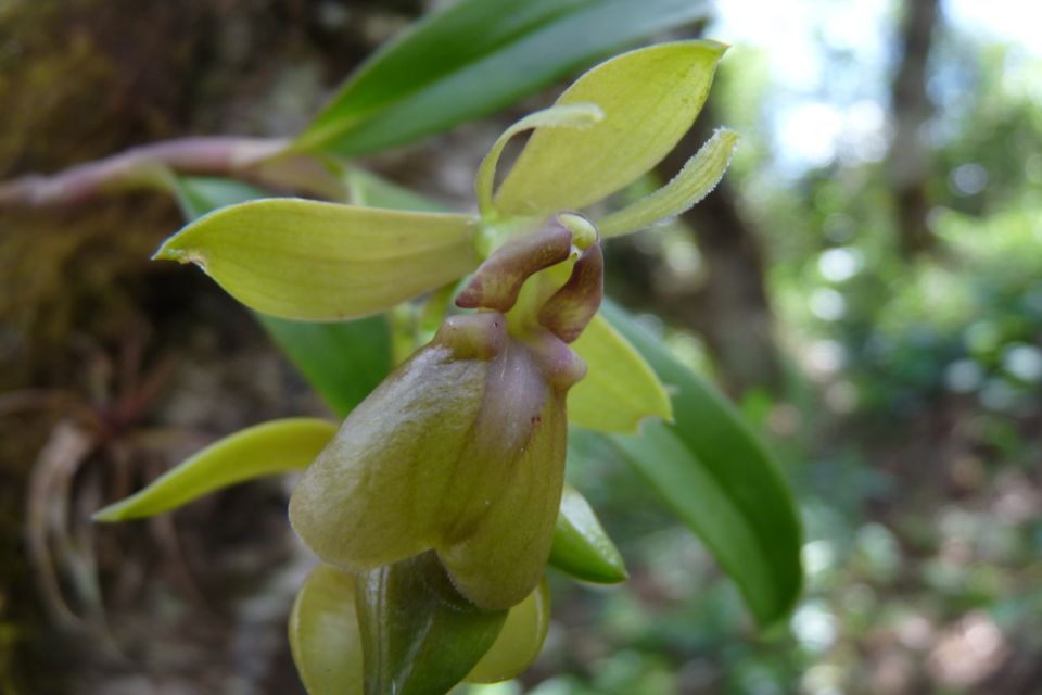 Found in southern Peru and western Bolivia in montane forests at elevations of 1800 to 2650 meters as a medium sized, cool to cold growing epiphyte with simple, cane-like, terete, straight, new stem produced from the middle of the subapical internode of the previous stem and carrying 3 to 7, narrowly oblong, acute, sub-coriaceous, articulate, narrowly oblong, acute, smooth, margin entire leaves that blooms in the winter on a terminal, erect, arising on a mature stem, occuring only once, nodding, racemose, peduncle to .8" [2 cm] long, laterally compressed, ancipitous, rachis, unadorned, laterally compressed, [3 to 7 cm] long, overall, successively 4 to 7, 12 to 20 flowered inflorescence with much longer to shorter than the ovary, triangular, acuminate floral bracts and carrying resupinate, green flowers with the lip and apex of the column tinged with purple.