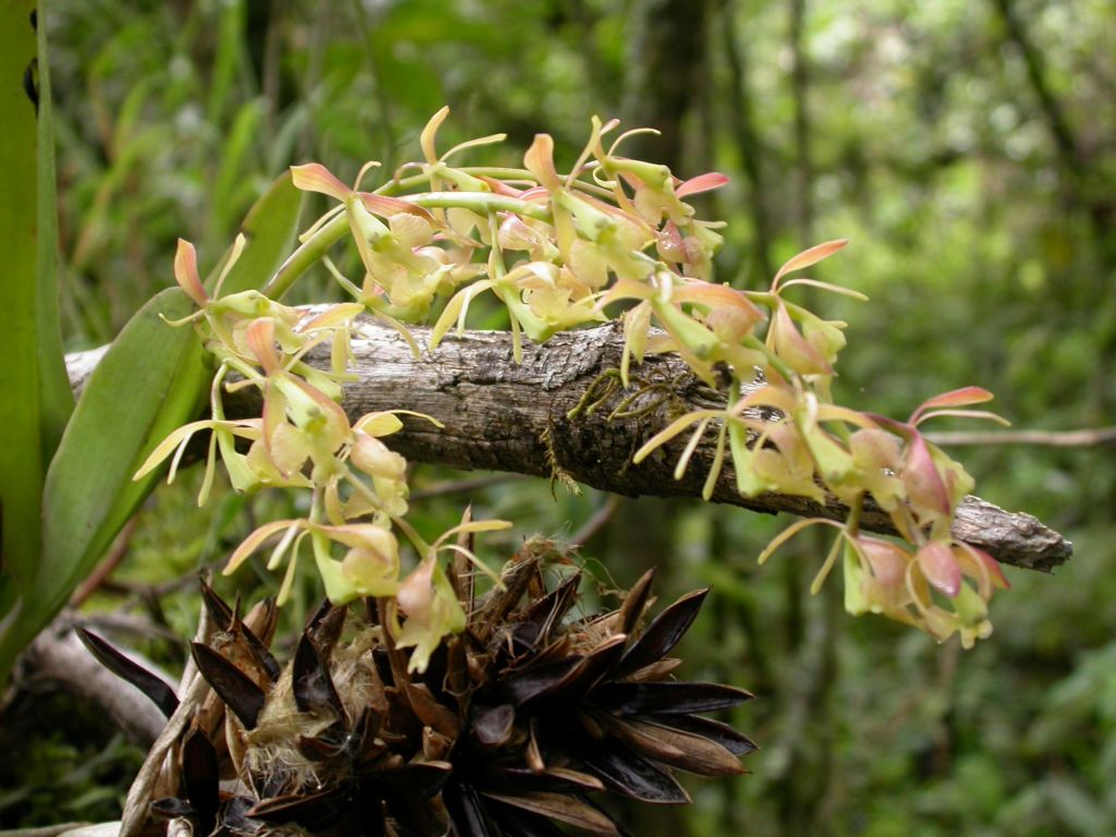 Found from Venezuela, Colombia, Ecuador, Peru, Bolivia at eleavtions of 2150 to 3000 meters in cloud forests on steep rocky, grass and brush covered slopes as a large sized, cold growing, reedstem epiphyte or lithophyte with erect, leafy stems enveloped basally by a few, tubular, inflated, scarious sheaths and carrying several, ligulate, emarginate, coriaceous, bilobed apically, conduplicate below, into the clasping base leaves that blooms throughout the year on a 11" [28 cm] long, massive, many flowered panicle arising from the apex of a mature stem and having a spathaceous bract.