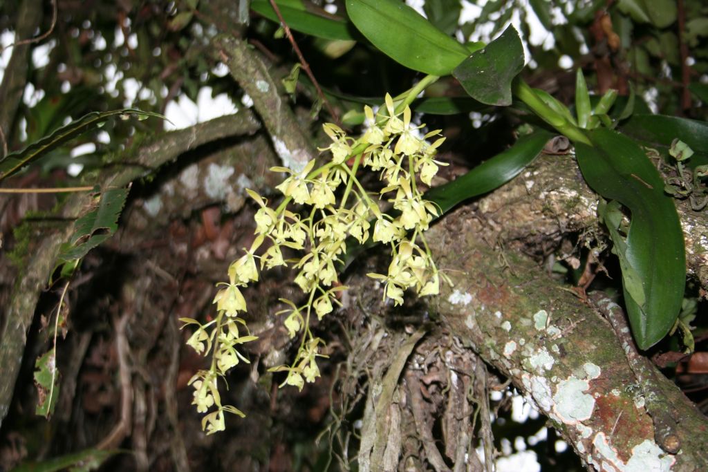 "Epidendrum excisum Lindl. belongs to the GROUP Excisum SUBGROUP Excisum type which is characterized by the sympodial, caespitose habit, cane-like stems with numerous leaves, the inflorescence racemose or an open panicle with a few branches, the 1 to 2 large spathes at the base of the inflorescence, the 3-lobed lip and medium sized flowers. The species is recognized by the laterally flattened stems, an erect to arching, laxly-flowered, paniculate inflorescence with smaller, greenish yellow flowers, more or less tinged with copper. Epidendrum ferreyrae has tall stems, a prominent, conduplicate spathaceous bract, with similar, though somewhat smaller bracts subtending the branches of the inflorescence, the greenish flowers, with the outer tepals more or less purple, the oblanceolate, subacute petals, and the 3-lobed lip with an entire margin, the lateral lobes dolabriform, and the much smaller midlobe, subtriangular, reminiscent of the unrelated Costarican E. storkii Ames. It is very similar to E. lesteri Hágsater & Dodson which has lanceolate, acute, dark green leaves with the underside reddish, the pink-colored, obtuse spathe, the nutant, dense- ly flowered inflorescence branching near the base into several similar racemes, and the green, pale burguny-red tinged flowers; the petals linear, the lateral lobes of the lip subreniform, midlobe rectangular, the apex truncate, somewhat bilobed, short-apiculate. It closely resembles Epidendrum orthoclinium Hágsater & Dodson which has narrower leaves, a more lax-flowered inflorescence smaller greenish yellow flowers with acute petals, with the clinandrium hood upturned, with the margin erose. Epidendrum tenuispathum C.Schweinf. has a somewhat similar habit, with an erect, paniculate inflorescence, and the lip wider than long." adapted from Plate 936 Hagsater etal 2007