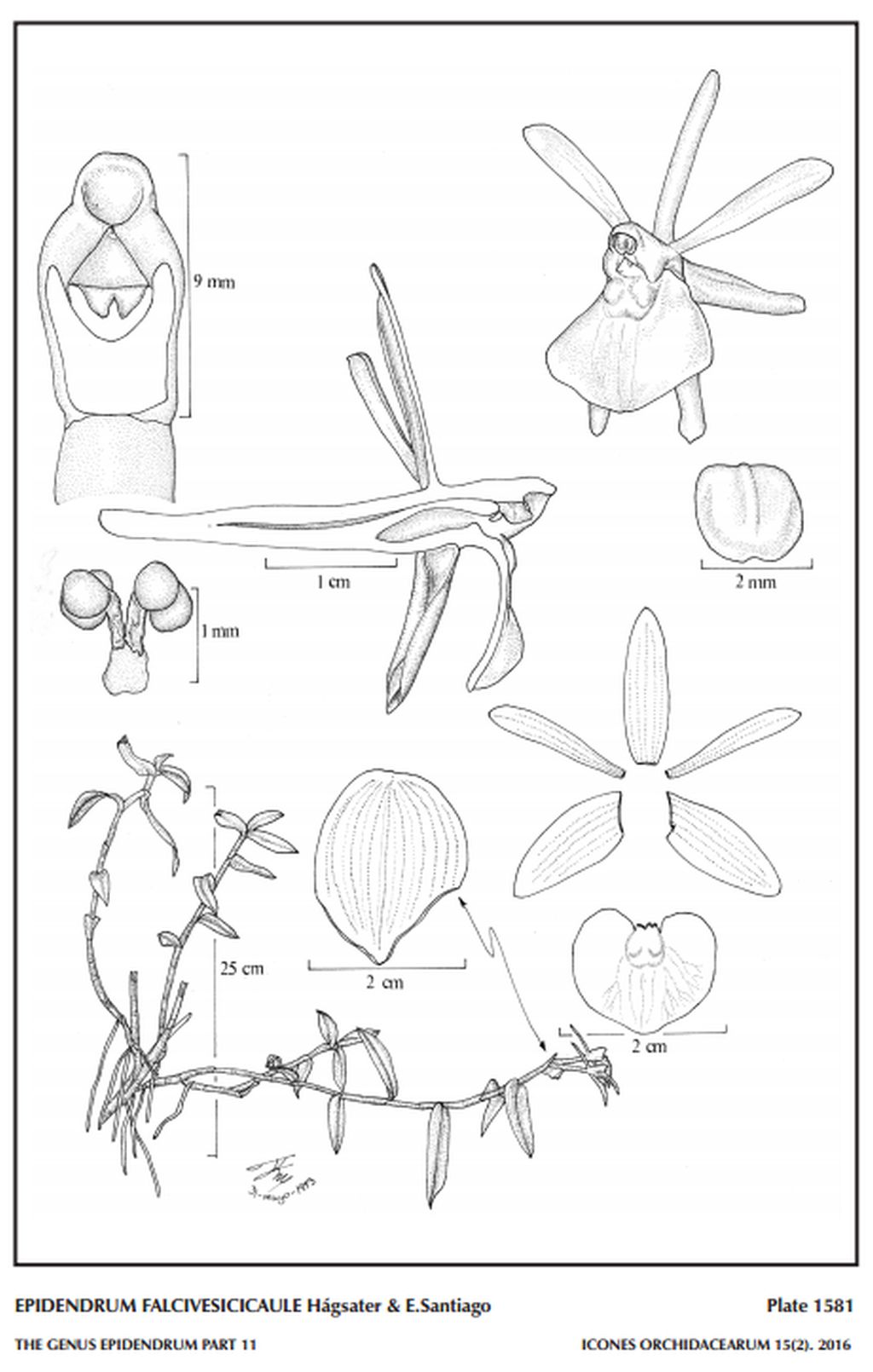 "Epidendrum falcivesicicaule belongs to GROUP Megalospathum characterized by the caespitose but branching habit, many-leaved stem, fleshy, oblique leaves, a short, few flowered, raceme subtended by large semi-ovate spathaceous bracts, resupinate flowers, the column more or less united to the lip, and the SUBGROUP Vesicicaule which has a sympodial habit, numerous leaves throughout the stems, the leaves concolor, green, lip cordiform and bicallose. The species is recognized by the lanceolate leaves 1.12 to 2.12" x .32 to .52" [2.8 to 5.3 x 0.8 to 1.3 cm], a 2 flowered elongate inflorescence, with two imbricating spathes, flowers apple green, the calli and disc of the lip white, sepals .72" [18 mm] long, lip widely cordiform, with a pair of calli, elongate, prominent, on a thickened, rounded platform, white, spongy; growing at elevations of 1900 to 2700 meters; column straight, clinandrium-hood slightly incurved. Epidendrum vesicicaule has narrowly lanceolate leaves 1.4 to 2.4" x .16 to .32" [3.5 to 6.0 x 0.4 to 0.8 cm], an orbicular-cordiform lip with a pair of small, parallel, low calli, extended into an elliptic fleshy, thickened disc which nearly reaches the apex of the lip; column slightly upturned towards along the basal half, clinandrium-hood fleshy, truncate, straight; growing at elevations of 3500 to 3800 meters. Epidendrum miradoranum Dodson & D.E.Benn. has ovate-lanceolate leaves .48 to 1.08" x .2 to .4" [1.2 to 2.7 x 0.5 to 1.0 cm], a single apical spathe .64" [16 mm] long, and up to 4 green flowers slightly tinged pale pink, sepals .88 to 1" [22 to 25 mm] long, and the lip rectangular-reniform, with two short, sub-orbicular calli. Epidendrum chaparense Dodson & R.Vásquez has shorter linear-lanceolate leaves, 1 x .32" [25 x 8 mm], a two-flowered inflorescence, flowers smaller, greenish white, sepals .52" [13 mm] long, lip sub-orbicular, with a pair of short, globose calli. Epidendrum cardiomorphum Hágsater & E.Santiago has somewhat larger leaves, 1.6 to 3.44" [4.0 to 8.6 cm] long, a single spathe subtending the inflorescence, pale green, membranaceous flowers, the lip cordiform with multiple thickened veins and two small calli, laterally compressed, the disc with three very thin, low, parallel ribs which disappear before the middle of the lip, and with multiple radiating thickened veins; clinandrium-hood slightly surpassing the body of the column, fleshy, straight. Epidendrum platypetalum Hágsater has narrowly ovate leaves, .2 to 1.84" x .12 to .44" [0.5 to 4.6 x 0.3 to 1.1 cm], sessile inflorescence subtended by a single spathe, reddish green flowers, the disc of the lip with small calli and white ribs, growing at elevations around 2500 meters. Epidendrum pachyclinium Hágsater & E.Santiago has obliquely lanceolate leaves, 1.12 to 3.32"x .24 to .44" [2.8 to 8.3 x 0.6 to 1.1 cm], a sessile, two-flowered inflorescence, sepals .68" [17 mm] long, the lip orbicular-cordiform with 2 laminar calli and 2 short, inconspicuous ribs; column arched, clinandrium-hood very fleshy, prominent and slightly upturned. Epidendrum lagotis Rchb.f. has ovate-elliptic leaves .8 to 2.4" x .4 to .92" [2 to 6 x 1.0 to 2.3 cm], a single obliquely semi-ovate spathe, sepals .68 to 1" [17 to 25 mm] long, petals widely spatulate, .84 x .32" [21 x 8 mm], and the lip orbicular, with a pair of small sub-spherical calli." Hagsater etal 2016