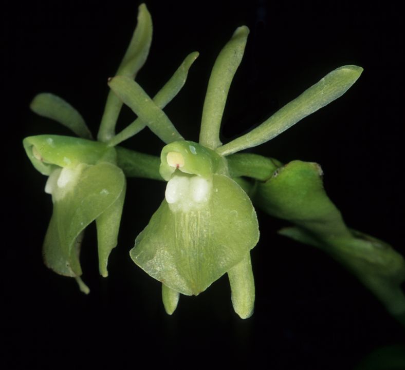 Found in Colombia, Ecuador and Peru along the Cordillera Oriental in tropical rainforests at elevations of 1900 to 2700 meters as a small sized, cold growing epiphyte with cane-like, terete, thin, suberect stems enveloped basally by tubular, nonfoliar sheaths and carrying 6 to 7, all along the apical 2/3's of the stem, unequal in size, basally smaller, articulate, spreading, lanceolate, acute, minutely apiculate, apical margin papillose, subcoriaceous, apple green leaves that blooms in the mid winter, spring and summer on a terminal, occuring only once, peduncle to 1.8" [4,5 cm] long, sub-terete, nearly totally hidden by the obliquely hemi-elliptic, conduplicate, tubular towards the base, partly imbricate spathe, rachis very short, 2 to 2.8" [5 to 7 cm] long overall, simultaneously 2 flowered inflorescence with very short, triangular, acute, embracing, hidden within the spathes floral bracts and carrying resupinate, pale apple green, semen scented flowers with white calli .