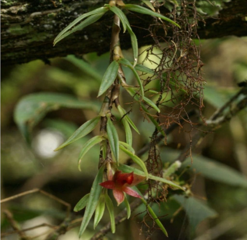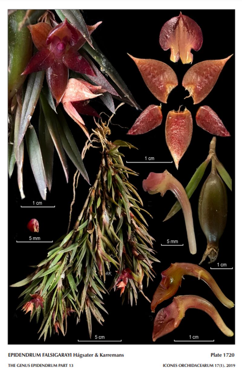 "Epidendrum falsigarayi belongs to the GROUP Kalopternix SUBGROUP Garayii which is recognized by pendent chain of stems, arising each from a sub-apical internode of the previous stem, each with 1 to 3 linear-lanceolate leaves [in the primary stem there are up to 6 leaves in a fan], inflorescence apical, flowering only once, 1 to 2 flowered, the flowers non-resupinate, green to red or yellow, the lip cordiform. The species is recognized by the 3 to 6 leaved stem segments, leaves 1 to 2" x .12 to .02" [2.5 to 5.0 x 0.3 to 0.5 mm] long, 1 brick-red flower, ovate, acuminate sepals .48 to .492" [12.0 to 12.3 mm] long, triangular ovate, acute petals, .346 x .484" [8.6 x 4.4 mm], and a widely cordiform, apiculate lip .292 x .396" [7.3 x 9.6 mm]. Epidendrum wolfii Hágsater & E.Santiago has short, bifoliate, cane-like stems, 2, linear-lanceolate leaves .44 to 1.08" [1.1 to 2.7 cm] long, sessile, two-flowered inflorescences, successive and opposite, pink, immaculate flowers, the lip is widely cordiform with the apex obtuse, the disc with a single evident, low, wide rib running down the middle. Epidendrum carmelense Hágsater & Dodson forms pseudobulbs at the end of the unifoliate stems, leaves are 3.5-8.5 cm long, with 1-2 greenish to ochre flowers with red dots, the lip is reniform without any ribs. Epidendrum garayi Lřjtnant has 2 to 4leaved stems, the leaves linear-lanceolate, up to 2" [5 cm] long, flowers purplish green, the lip cordiform with the apex acuminate, the disc has 3 thickened veins running nearly the entire length of the lip. Epidendrum palalabrum Hágsater has acuminate, non-foliar, a single leaf 2 to 3.48" x .24 to .32" [5.0 to 8.7 x 0.6 to 0.8 cm], sepals .52 to .56" x 1.48 to 1.6" [13 to 14 x 3.7 to 4.0 mm], lanceolate, acuminate, 3-veined, petals .468 x .1" [11.7 x 2.5 mm], lanceolate, acuminate and lip .44 x .296" [11 x 7.4 mm], shovel-shaped, base truncate, basal half quadrate, apical half triangular, apex acuminate." Hagsater etal 2019
