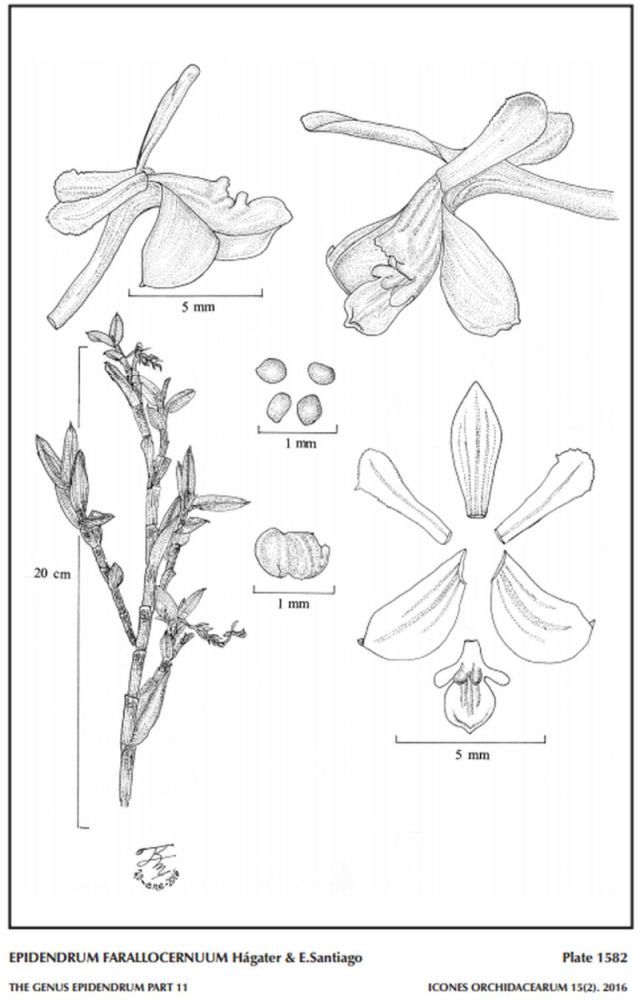 "Epidendrum farallocernuum belongs to the GROUP Andean SUBGROUP Cernuum , characterized by the cane-like, subapically branched stems, the branches much shorter than the main stem, coriaceous to sub-coriaceous leaves and fleshy flowers. The species is recognized by the lanceolate leaves, short nutant inflorescences .8 to 1" [2.0 to 2.5 cm] long, rachis zig-zag, flowers simultaneous, floral bracts nearly as long as the ovary, flowers yellow, small, sepals .18 to .188" [4.5 to 4.7 mm] long, petals oblanceolate-spatulate, with the apical margin erose; lateral lobes of the lip very small, obliquely oblong, the mid-lobe orbicular with the apex minutely apiculate. Epidendrum angeloglossum has a 2" [5 cm] long inflorescence, rachis straight, successive flowers, the floral bracts shorter than the ovary, flowers apple green, sepals tinged purple, sepals ,56 to .68" [14.0 to 16.5 mm] long, margin entire and revolute; lateral lobes of the obliquely ovate, mid-lobe not apiculate. Epidendrum zipaquiranum Schltr. is vegetatively very similar, but is found on the Cordillera Oriental of northern Colombia, has .16 to .4" [4 to 10 cm] long inflorescences, rachis straight, up to 35 successive, greenish yellow flowers, sepals .32 to .44" [8 to 11 mm] long, and the lateral lobes of the lip are obliquely semi-ovate, and the mid-lobe widely ovate." Hagsater etal 2016