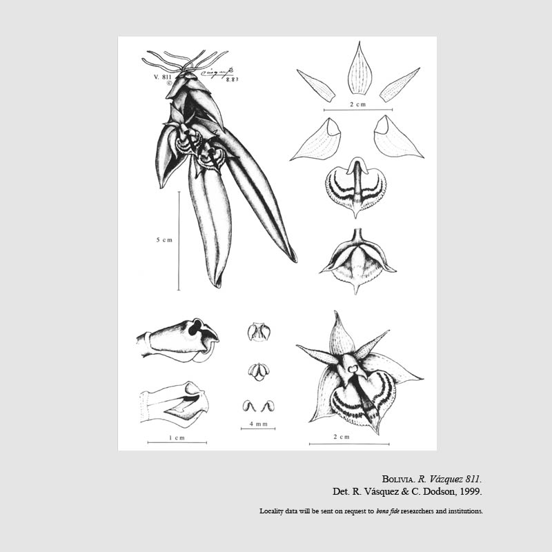 References W3 Tropicos, Kew Monocot list , IPNI ; *Revista Soc. Boliv. Bot. 2(2): 145, f. 2, 5 R.Vásquez & Dodson 1999 drawing fide; Orchids of Bolivia Vol II Laelinae Vasquez & Ibisch 2004 drawing/photo fide