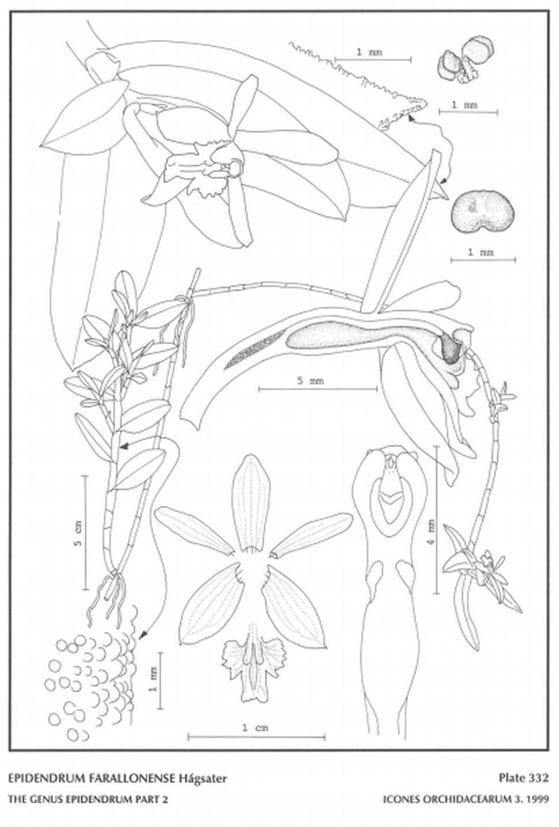 "Epidendrum farallonense belongs to the GROUP Batesii characterized by the monopodial main stem with a subapical branching habit, acute leaves, successive, essentially non-resupinate flowers, opening one at a time, deep nectary, entire to 3-lobed lip with the lateral lobes more or less fimbriate to erose. The species can be distinguished by the green flowers, the 3-lobed lip, the lobes subequal in size, with the midlobe subrectangular and emarginate. Epidendrum laceratum also has a 3-lobed lip but the midlobe is triangular, acute. Epidendrum batesii Dodson has a 3-lobed lip with the midlobe much reduced, cuneate, 1-veined petals, the dorsal sepal being 68" [17 mm] long. Epidendrum silverstonei Hágsater has a deeply cordiform, orbicular, lacerate-dentate lip, 3-veined petals and 5" [12.5 mm] long sepals." Hagsater etal 1999