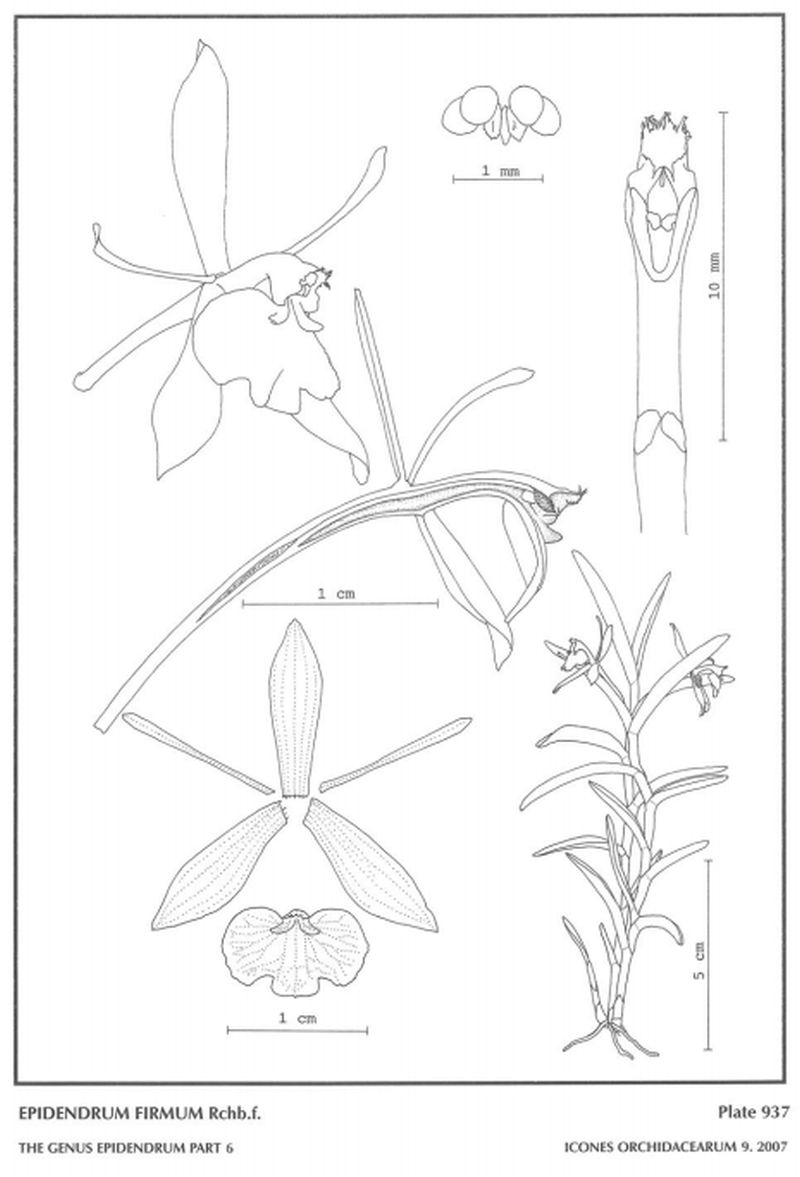 References W3 Tropicos, Kew Monocot list , IPNI ; Repert. Sp. Nov. Regni. Veg. Beih. 19: 37. Costa Rica Schlechter 1923; The Genus Epidendrum Ames 1936 as Epidendrum difforme var firmum; The Orchids of Panama L.O. Williams & P Allen 1946 as E difforme var firmum; Ceiba Vol 5 No 1 L O Williams 1956 as E difforme var firmum; Die Orchideen 3 Auflage Bd 1 Sonderabdruck aus Schlechter Lieferung 9 513 - 576 Brieger, Maatsch and Senghas 1977; Icones Planetarum Tropicarum Plate 1317 Atwood 1989 drawing fide; Field Guide to the Orchids of Costa Rica and Panama Dressler 1993; Icones Orchidacearum 2 Plate 142 Hagsater & Sanchez 1993 see recognition section; Icones Orchidacearum 2 Plate 150 Hagsater & Salazar 1993 see recognition section; Icones Orchidacearum 3 Plate 386 Hagsater 1999 see recognition section; Manual de las Plantas de Costa Rica Vol 3 Hammel, Grayum, Herrera and Zamora 2003; Icones Orchidacearum Vol 8 Plate 878 Hagsater & Sanchez 2006 see recognition section; Icones Orchidacearum Vol 8 Plate 888 Hagsater & Sanchez 2006 see recognition section; Icones Orchidacearum 9 Plate 937 Hagsater & Sanchez 2007 drawing fide; Icones Orchidacearum 11 Plate 1189 Hagsater 2008 see recognition section; Orchids of Costa Rica Vol 3 Morales 2009 photo fide; AOS Bulletin Vol 80 #2 2011 photo fide; Icones Orchidacearum 14 Plate 1402 Hagsater & Santiago 2013 See recognition section;
